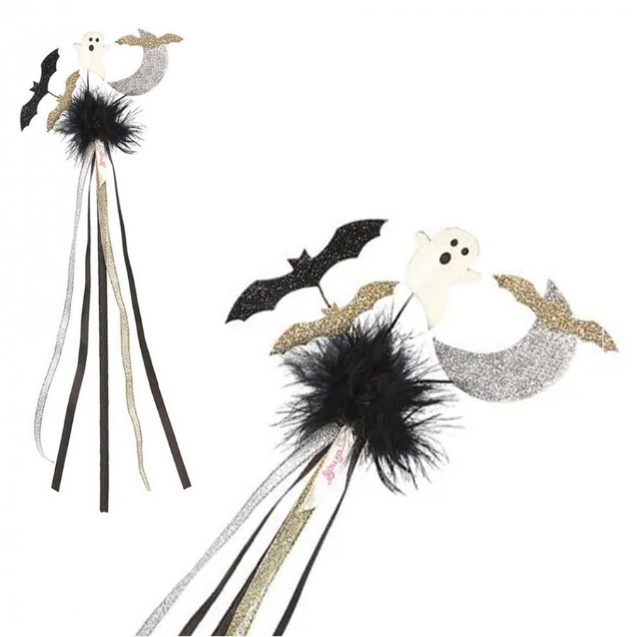 Decorada com apliques brilhantes de morcego e fantasma e fitas douradas e prateadas. Um verdadeiro chamariz! Para um look completo, combine a varinha com a fita para a cabeça correspondente.