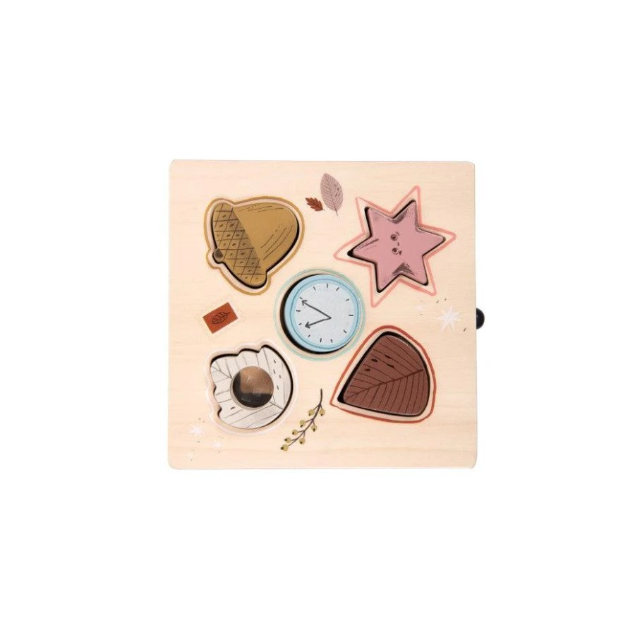 Caixa de encaixe de formas em madeira com lindas ilustrações para ajudar os pequenos a aprenderem sobre formas e cores. Contém 5 formas especialmente desenhadas para as mãozinhas (...)