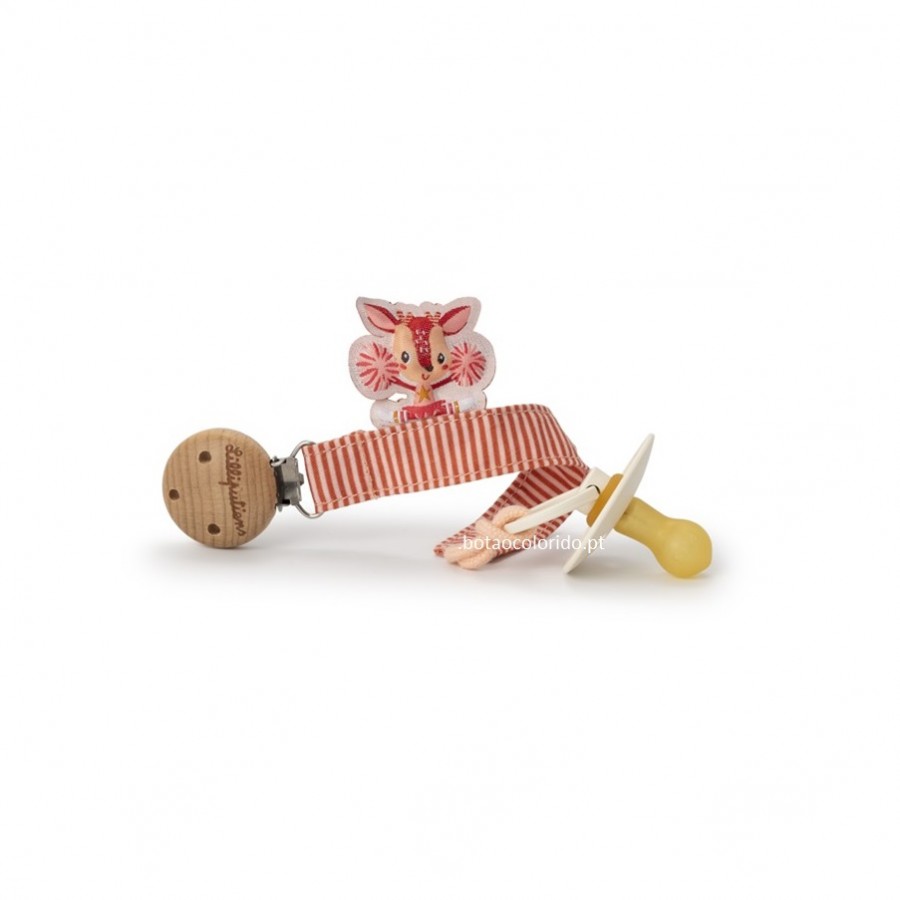 Este alegre porta chucha mantém a chucha sempre por perto. Feito de algodão orgânico e madeira certificada.