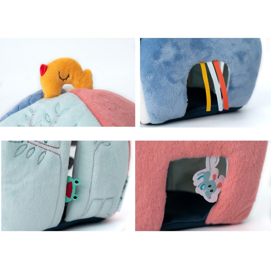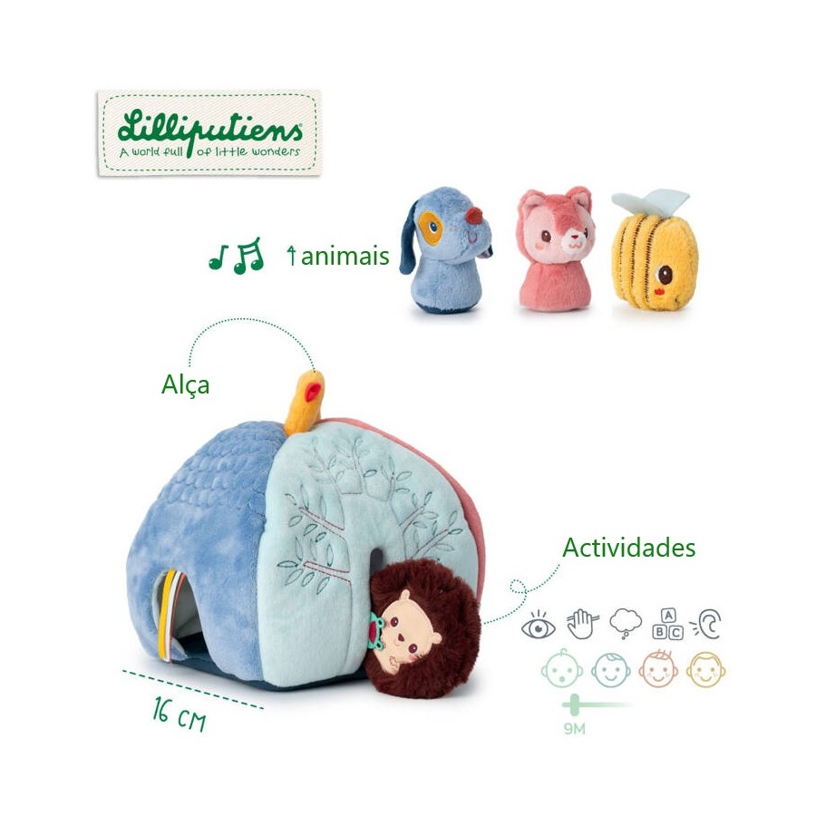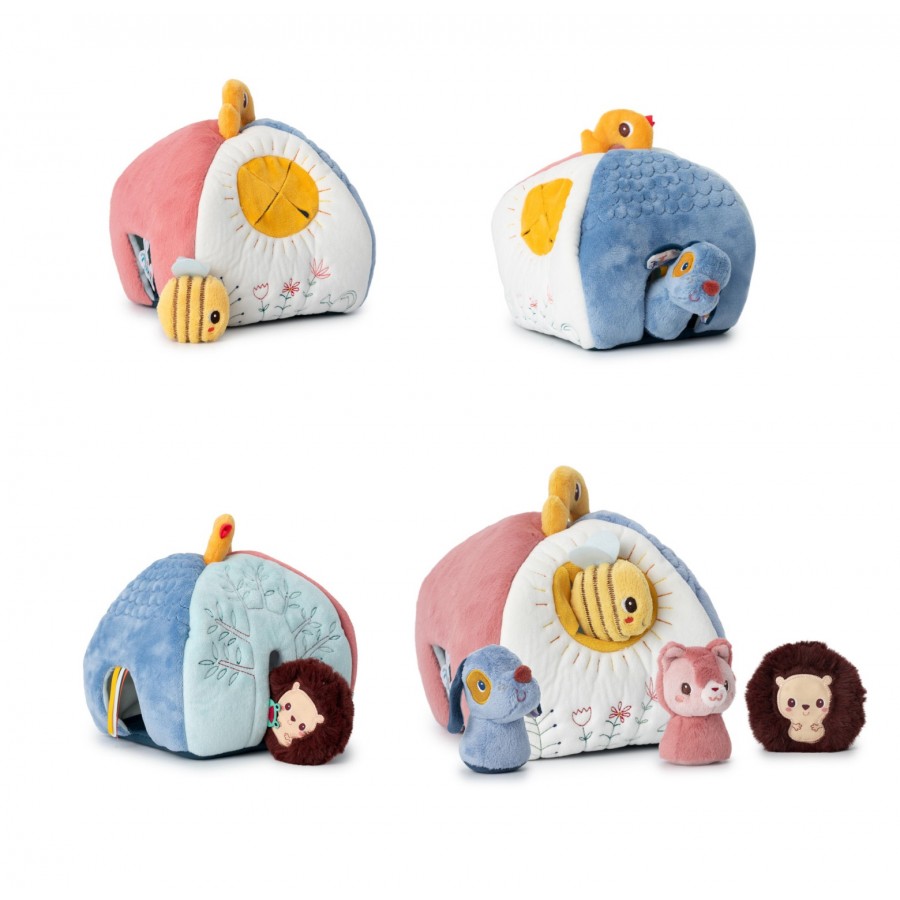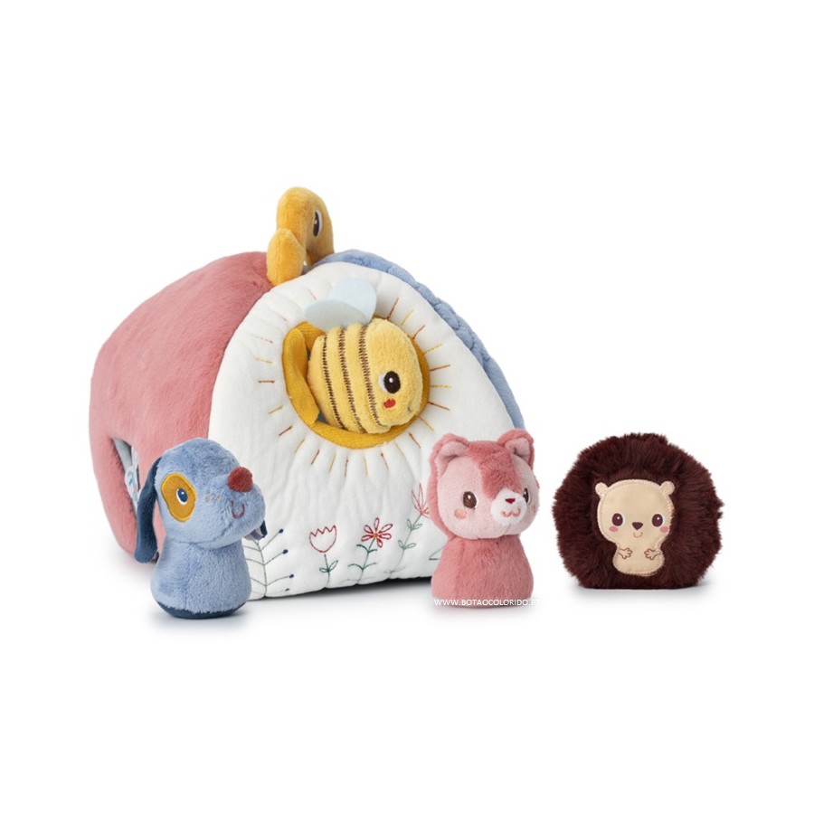 Esta casinha colorida está adornada com quatro aberturas, cada uma delas acolhendo um amigo diferente: um cão, um gato, um ouriço e uma abelha. São quatro chocalhos que emitem um som único. Cada morador está associado a uma cor ou ilustração específica nas laterais da casa. Isto permite que as crianças combinem e associem enquanto se divertem.