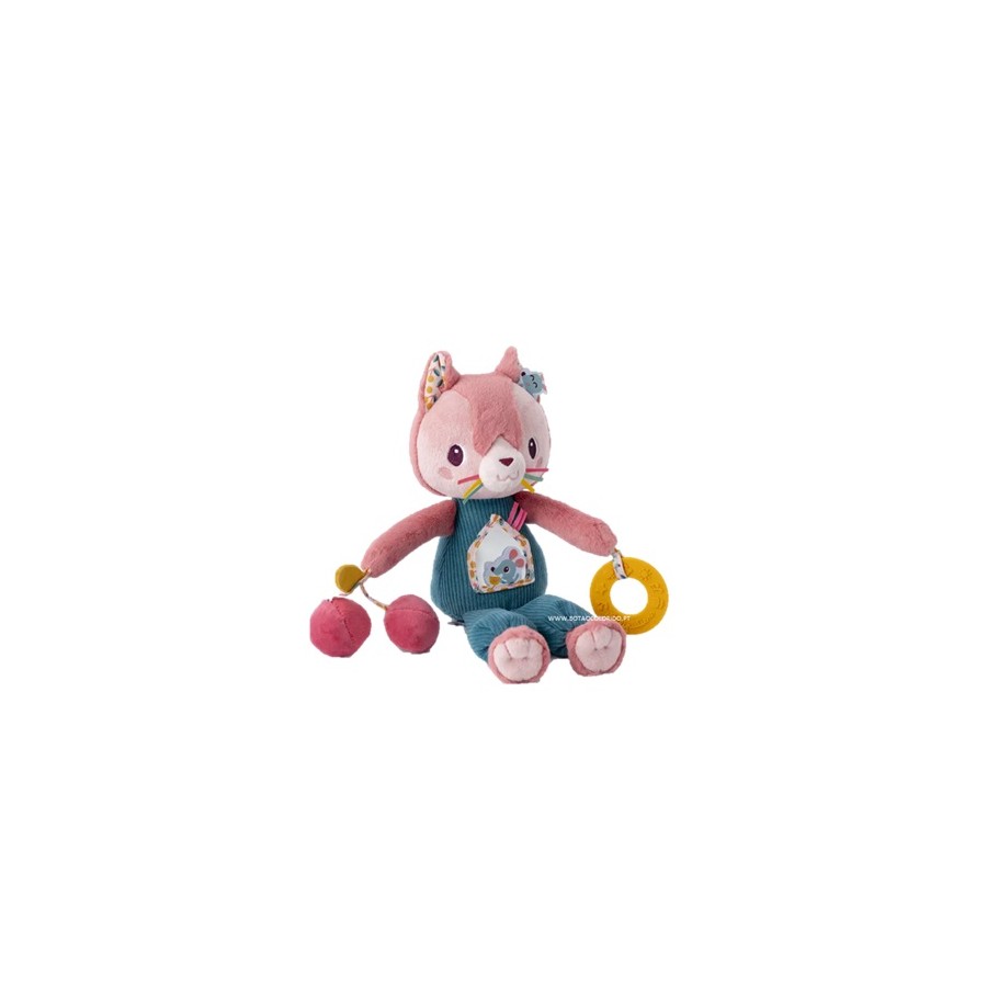 A gatinha Jeanne oferece uma infinidade de actividades para despertar os sentidos dos mais pequenos. A gatinha é tão macia que os mais pequenos vão adorar acariciá-la. Também tem muitas actividades para estimular os sentidos: espelho, guizo, papel crocante e um divertido mordedor com texturas - um peluche de primeira atividade para levar sempre consigo!