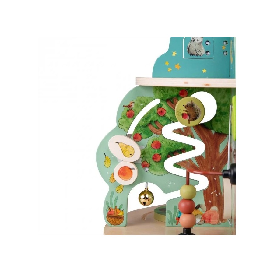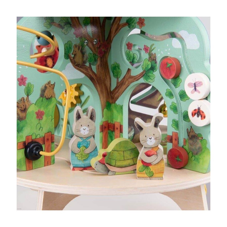 Apaixone-se pela delicadeza deste jardim de Três Coelhinhos. Um brinquedo completo para momentos de exploração e serenidade. Apresente aos seus filhos 4 cenários ilustrados do tema da natureza, para descobrir texturas como o feltro e uma infinidade de atividades de 'causa e efeito': ábaco, sinos, engrenagens, labirinto, espelho e pequenos personagens de madeira.