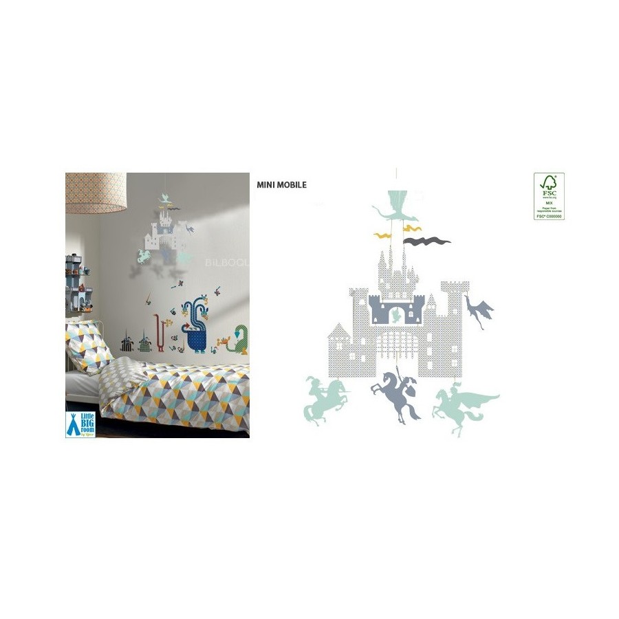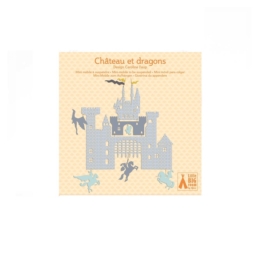 Este mini móbile é um pormenor elegante para o quarto de qualquer criança. Um castelo, cavaleiros a cavalo e dragões voadores.