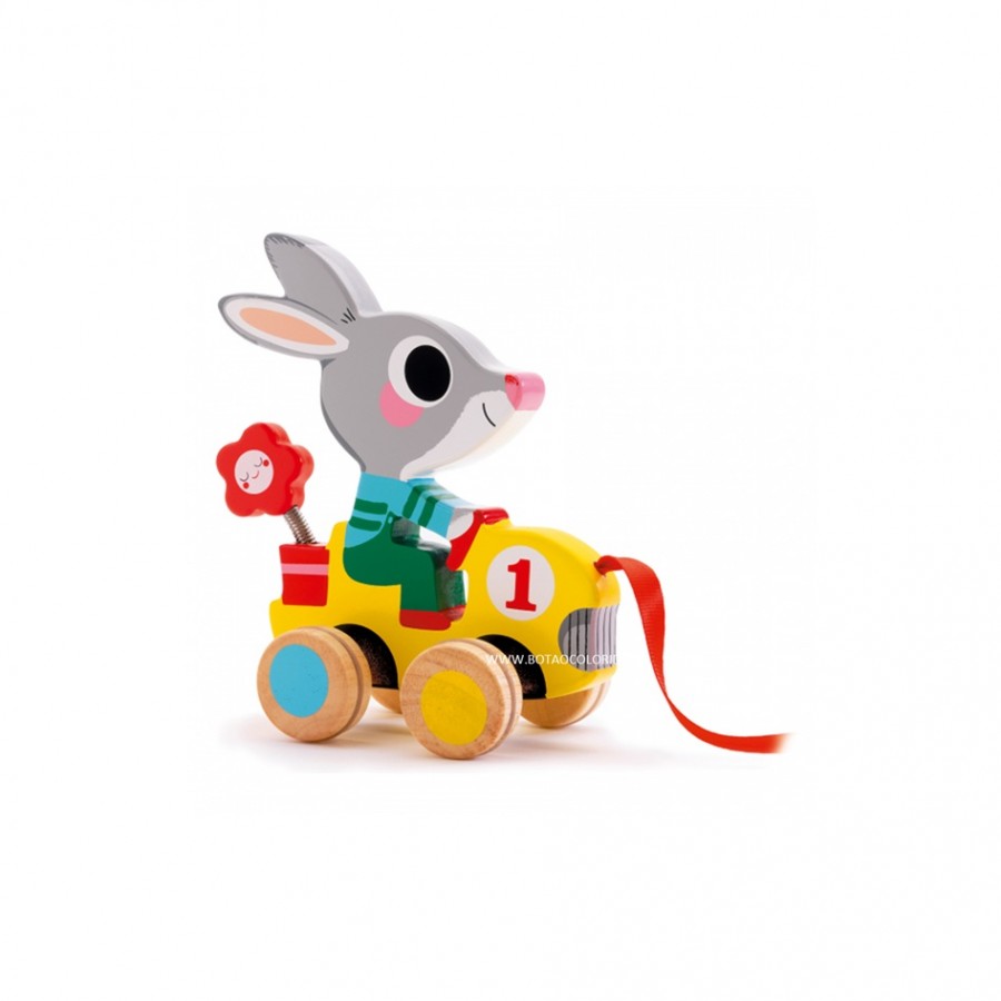 Um coelho colorido de madeira a conduzir o seu carro. Há uma flor numa mola na parte de trás do carro, que balança quando o brinquedo é puxado pelo seu pedaço de fita vermelha.