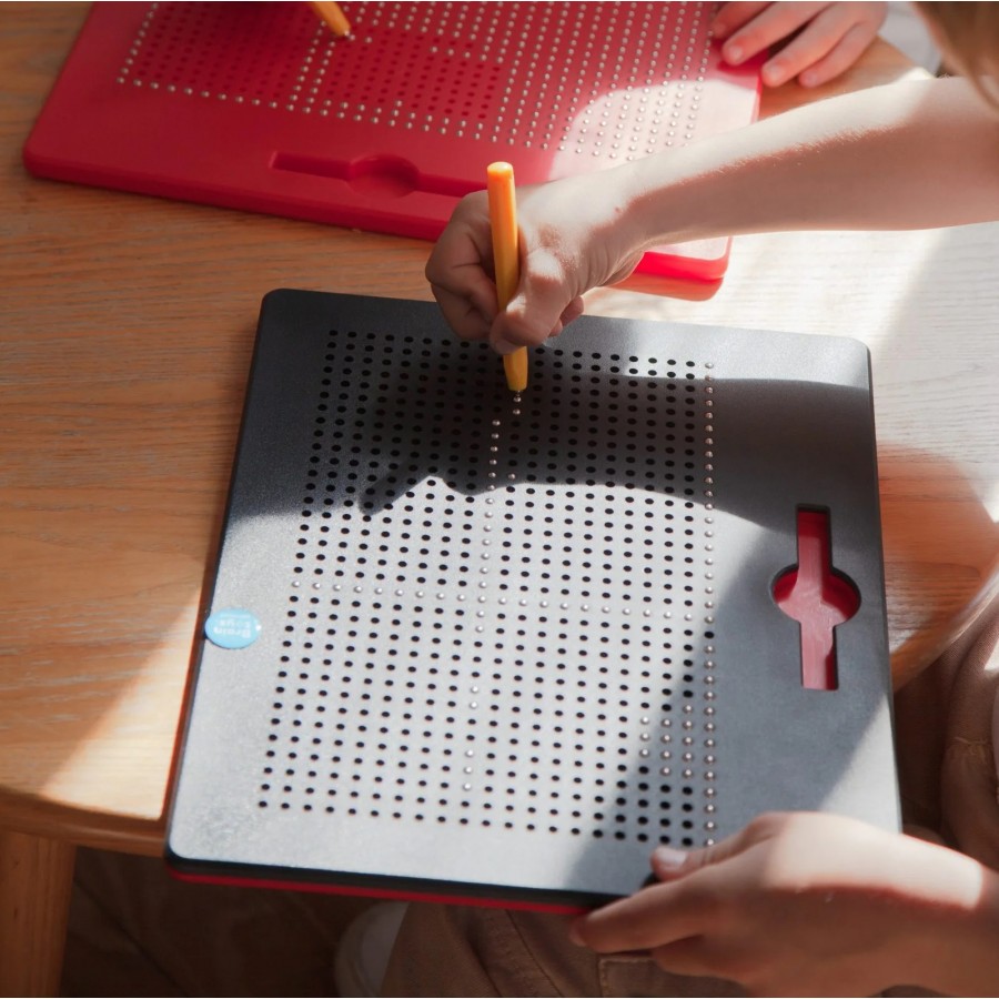 Esboce e desenhe com ímanes utilizando este fantástico jogo magnético. As crianças criam imagens enquanto arrastam a caneta magnética pela superfície da base para criar formas geométricas, animais, letras, veículos e muito mais. Uma poderosa ponta de caneta magnética atrai a esfera de metal encapsulada para os pequenos orifícios na superfície da grade. Incentive as crianças a recriar padrões ou projectar seus próprios desenhos.