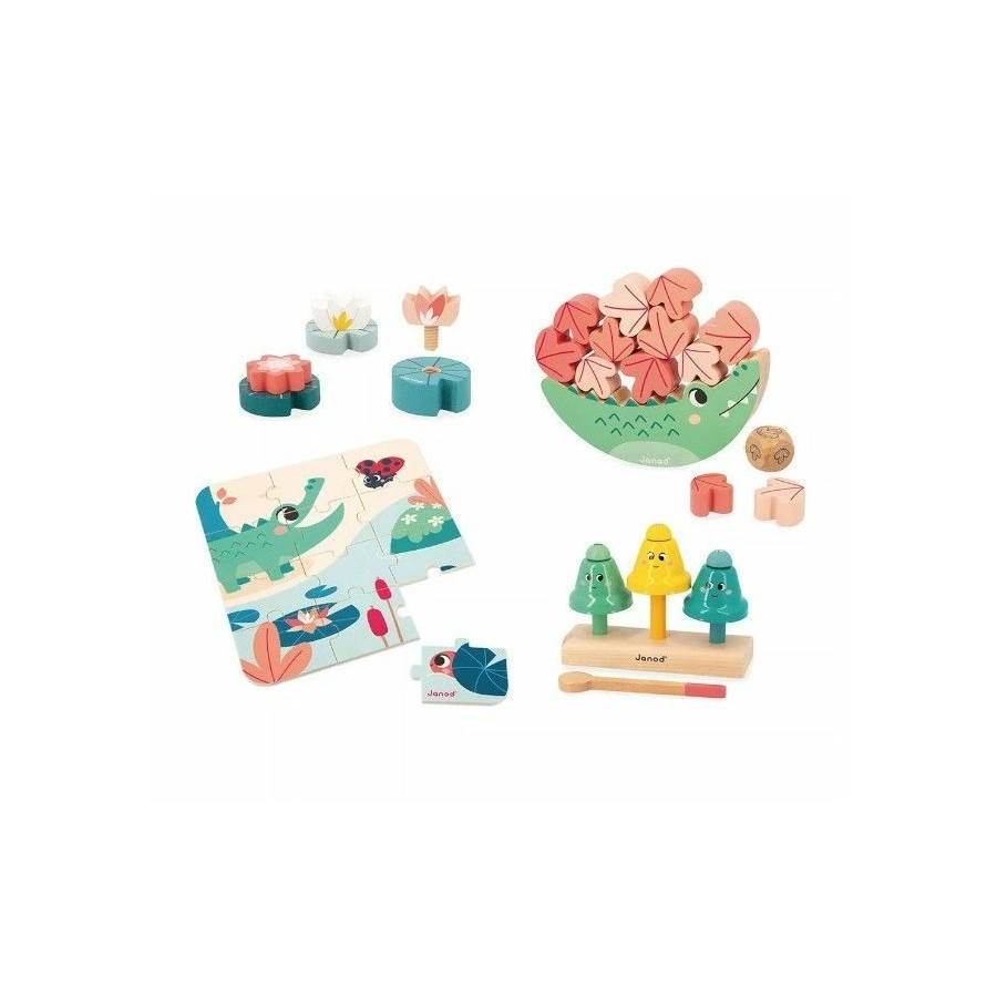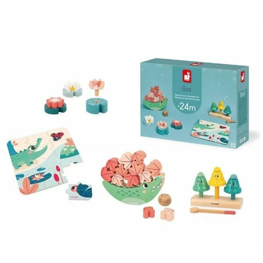 Caixa de 4 brinquedos em Madeira desenhada para ajudar a promover a concentração e a precisão de movimentos dos bebés. Aos 2 anos os bebés estão gradualmente a desenvolver funções cognitivas. Especialmente desenhada para promover a concentração e a precisão, a caixa de brinquedos sensoriais Janod, desenvolvida em parceria com especialistas em Psicomotricidade Infantil, estimula a visão, audição, vocabulário e motricidade fina dos mais pequenos.