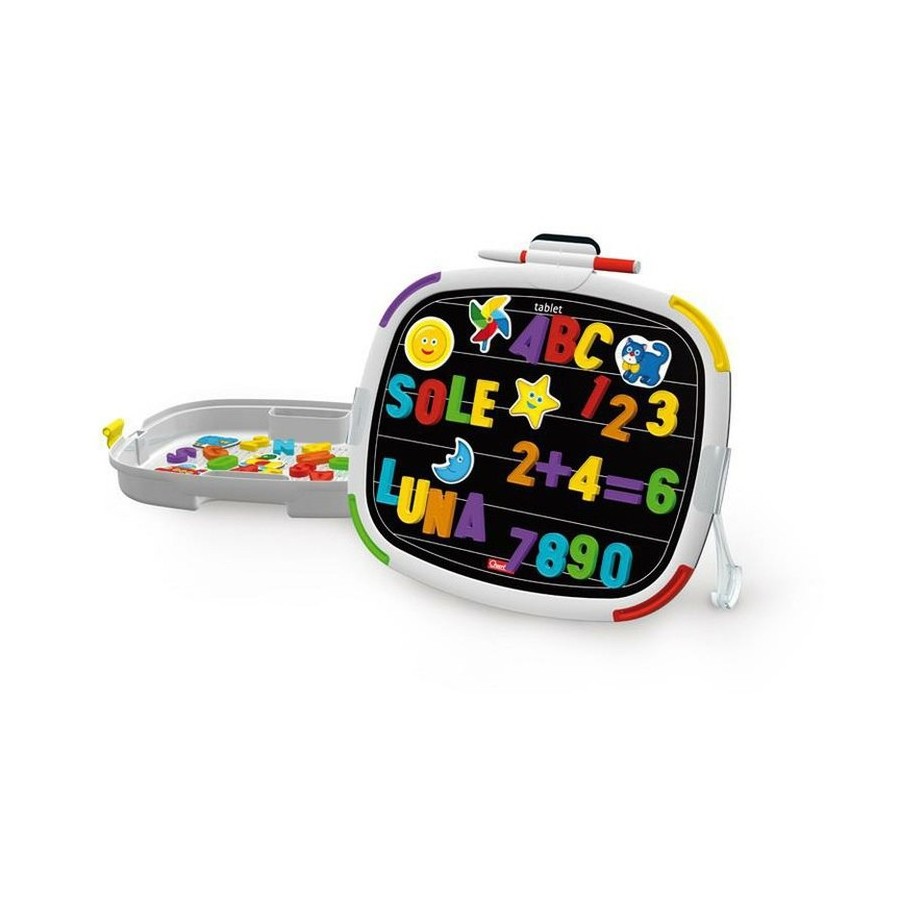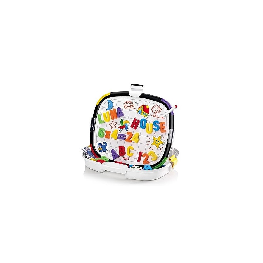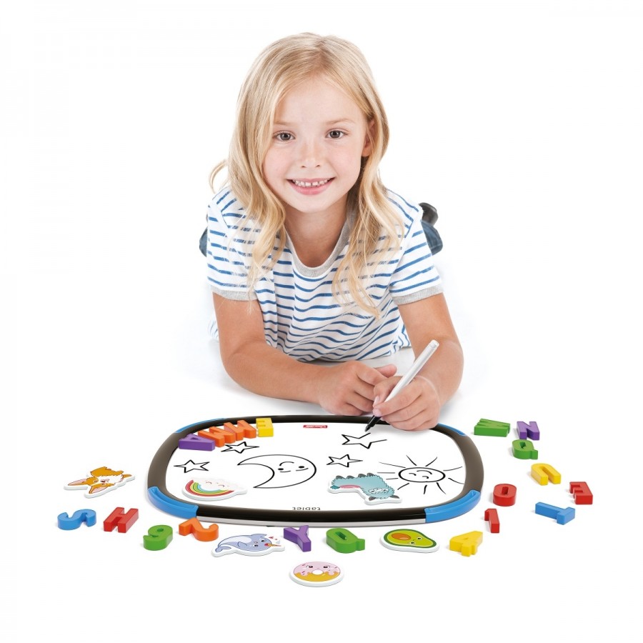 Uma nova linha de quadros magnéticos apagáveis e de dupla face, com design inovador ´sem cantos´: os cantos muito arredondados também estão protegidos por aplicações coloridas de borracha que tornam este brinquedo seguro, duradouro e absolutamente "à prova de criança". Utiliza as letras magnéticas em ambos os lados preto e branco e usa as canetas de feltro apagáveis para escrever e desenhar.