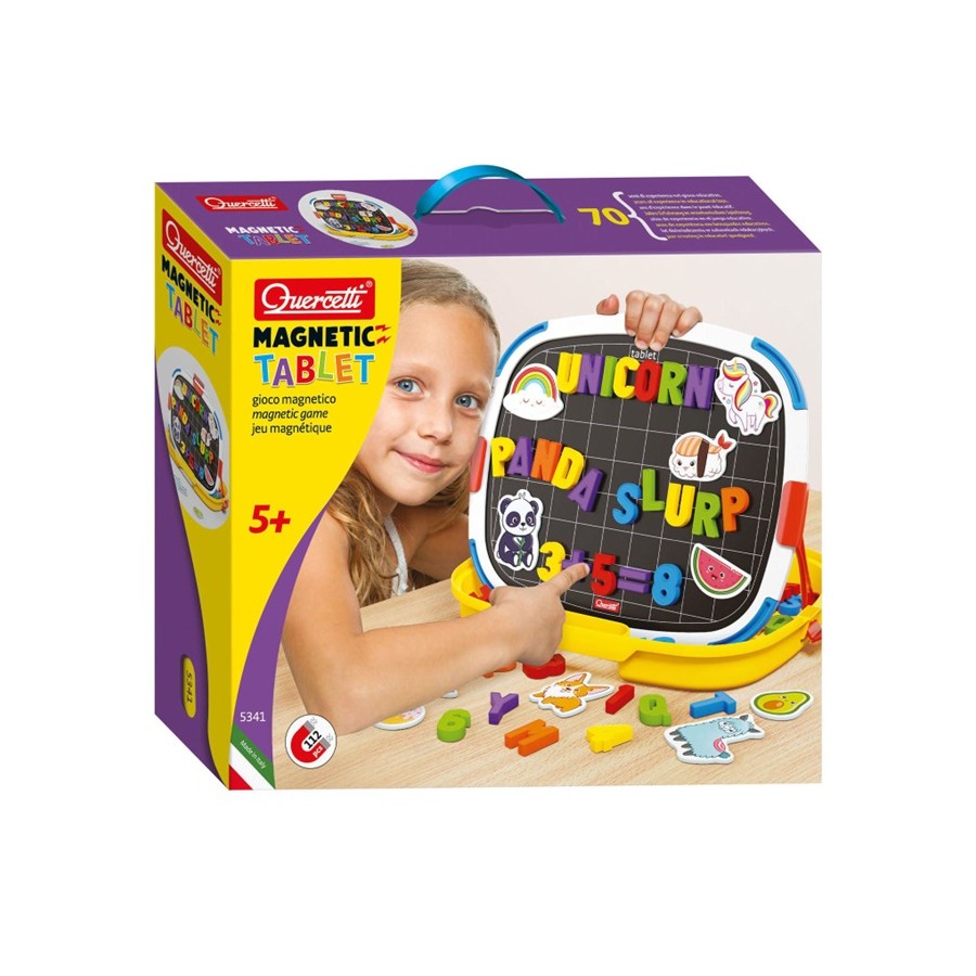 Pode-se ainda fixar cartões magnéticos ilustrados ao lado das letras para estimular a escrita das primeiras e palavras. Inclui suporte para colocar a caneta e apagador em qualquer lugar do quadro para que estejam sempre acessíveis e prontos para usar.