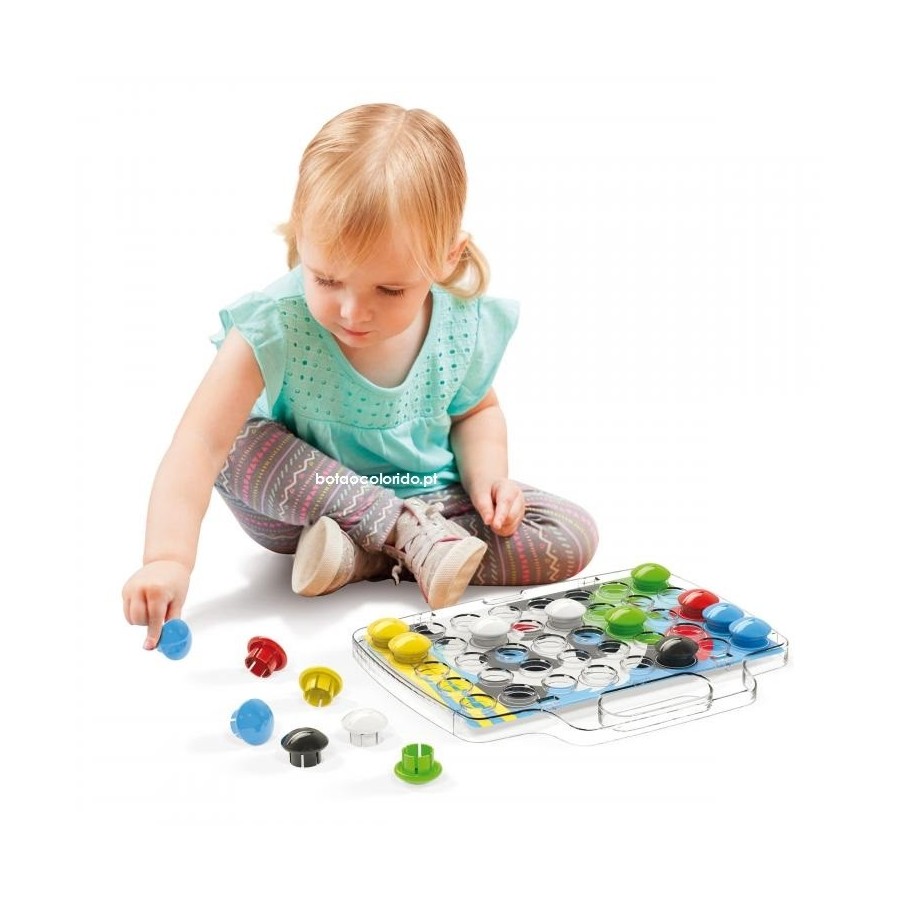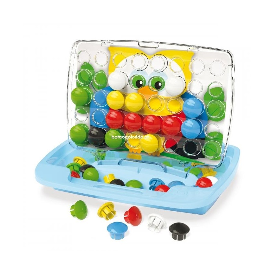 Cria mosaicos maravilhosos com peças de 6 cores diferentes. A base transparente tem orifícios onde as peças encaixam facilmente. Coloca os desenhos na base e associa a cor das peças, às cores do desenho, desenvolvendo a percepção visual. A embalagem, que permite guardar as peças no interior, contém uma pega para mais fácil transporte. Contém: maleta com alça; 48 peças de encaixe; 8+8 desenhos Marca | QUERCETTI