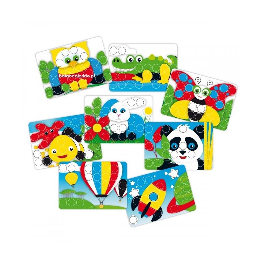Cria mosaicos maravilhosos com peças de 6 cores diferentes. A base transparente tem orifícios onde as peças encaixam facilmente. Coloca os desenhos na base e associa a cor das peças, às cores do desenho, (...)