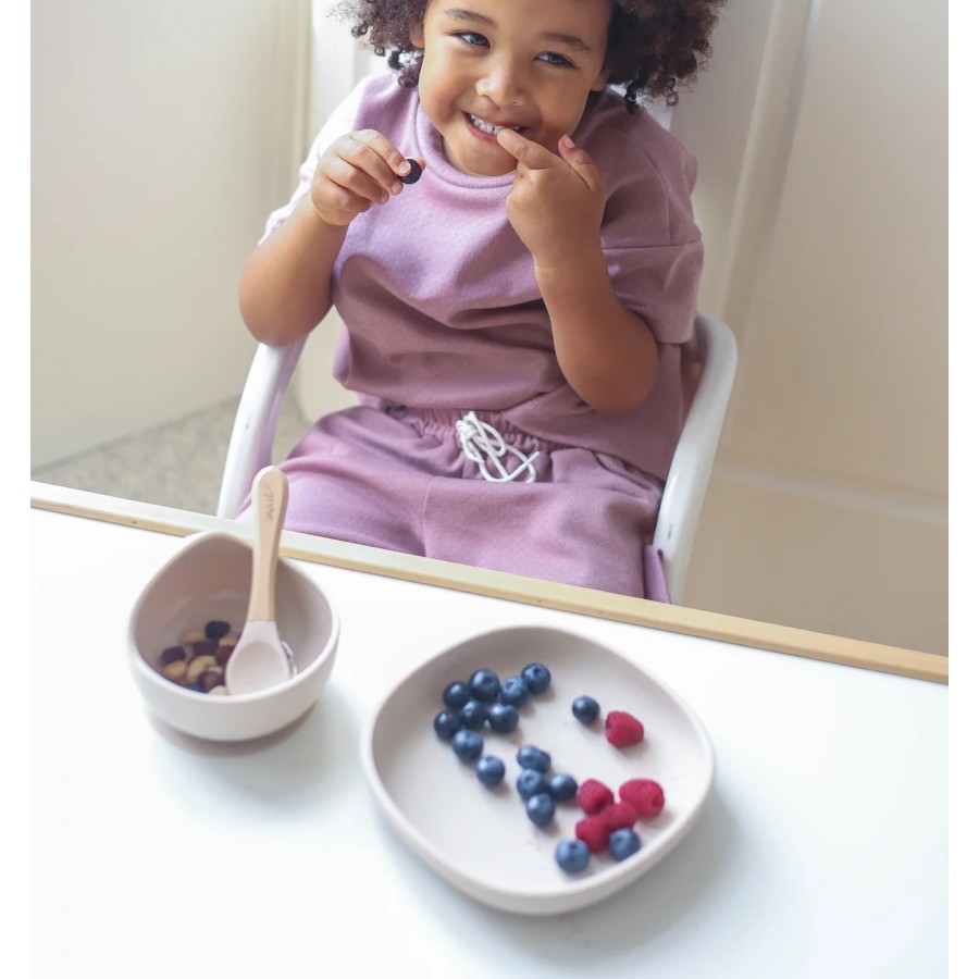 Prato de silicone com base aderente para fixar à mesa e impedir o seu movimento. Produzido em alto grau alimentar, macio, leve, flexível e duradouro, sem BPA, PVC, ftalatos e látex.