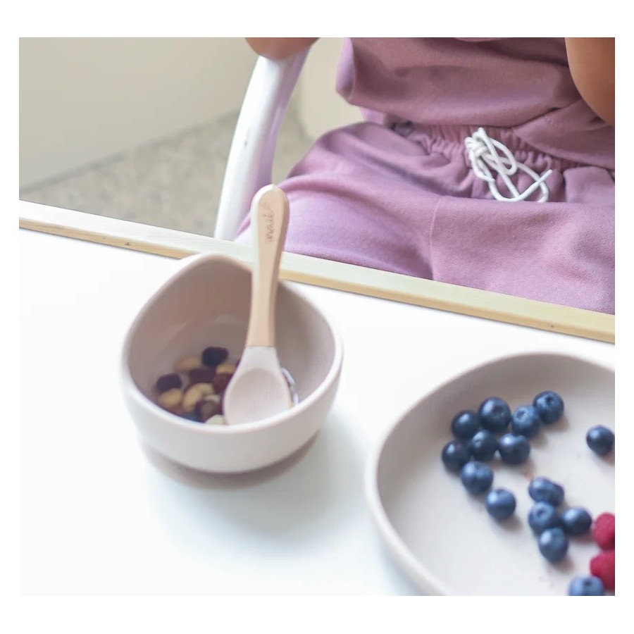 Conjunto de refeição (taça com ventosa + colher) perfeito para iniciar a alimentação. A taça de silicone tem um ventosa na base para que não caia nem se vire.