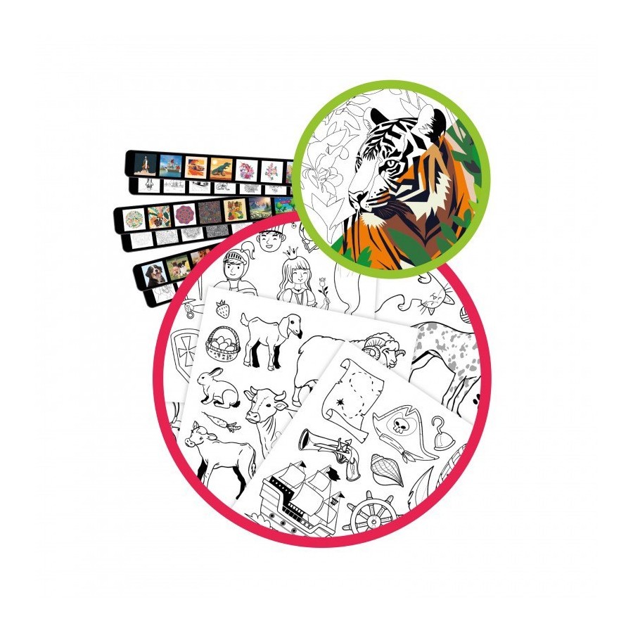 Contém 30 imagens e 200 padrões para reproduzir, para criar os seus próprios mundos e todos os materiais necessários para desenhar e colorir, 12 lápis de aguarela, 8 marcadores, um marcador preto fino, um lápis, uma borracha, um afia, um pincel, 10 folhas A5, 10 folhas A4, 5 marcadores, 1 rolo de cartaz de 5 metros e 1 manual ilustrado.