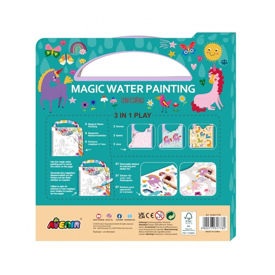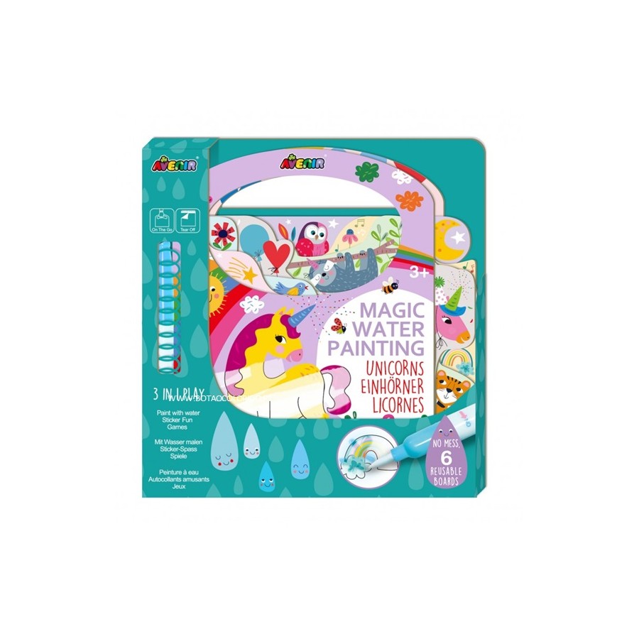 Contém 1 caneta d'água mágica, 6 imagens reutilizáveis, jogos reutilizáveis e autocolantes para aprender e se divertir