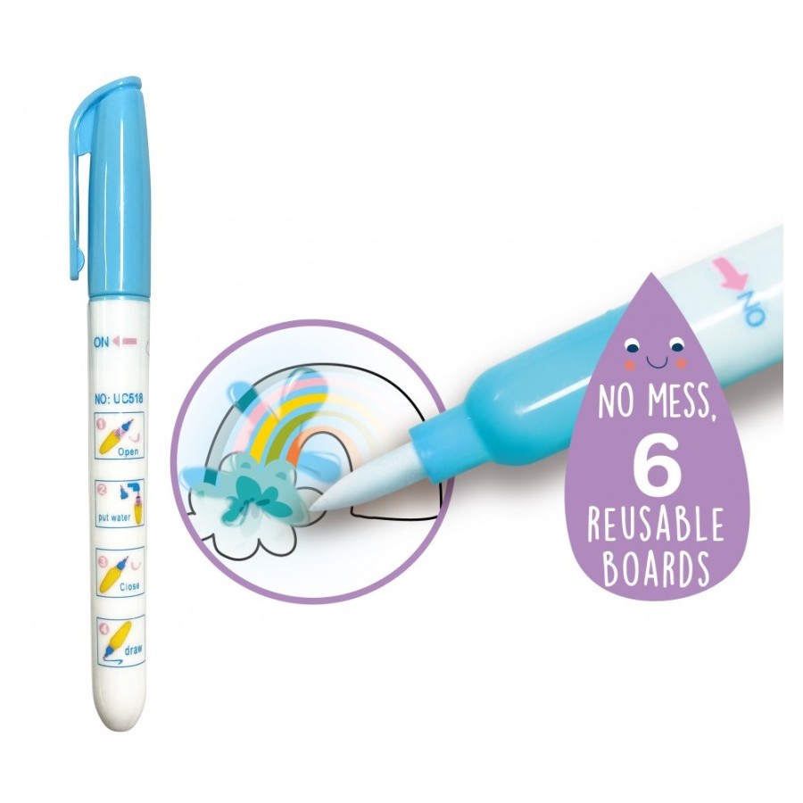 Use a caneta d'água mágica nas imagens reutilizáveis. A água revela as cores das imagens através do contacto da água com os desenhos, depois basta deixar secar e utilizar outra e outra vez. Sem manchas!