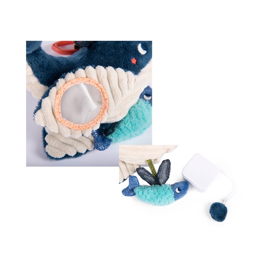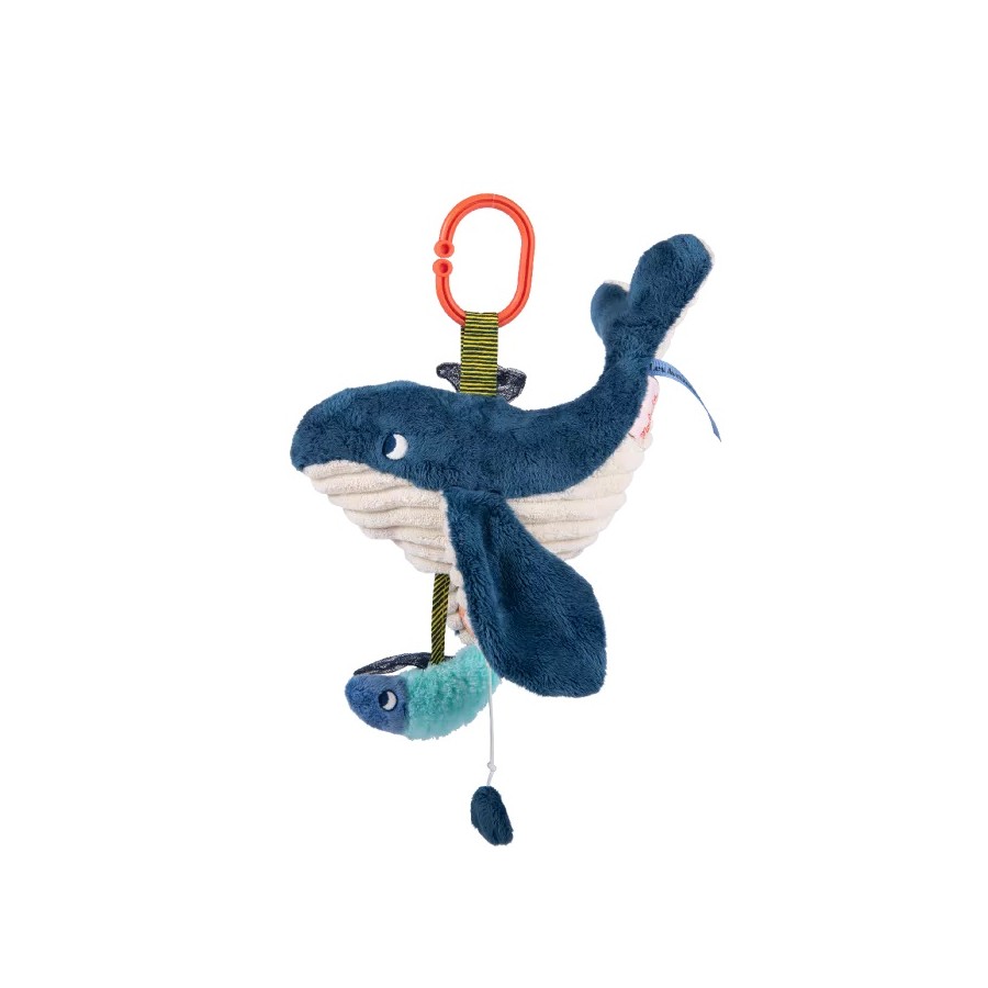 Esta baleia musical possui um prendedor universal. Ao som da sua doce melodia, o bebé adormecerá tranquilamente e ao acordar poderá brincar com o espelho debaixo da barbatana e redescobrir as diversas texturas deste tenro cetáceo.