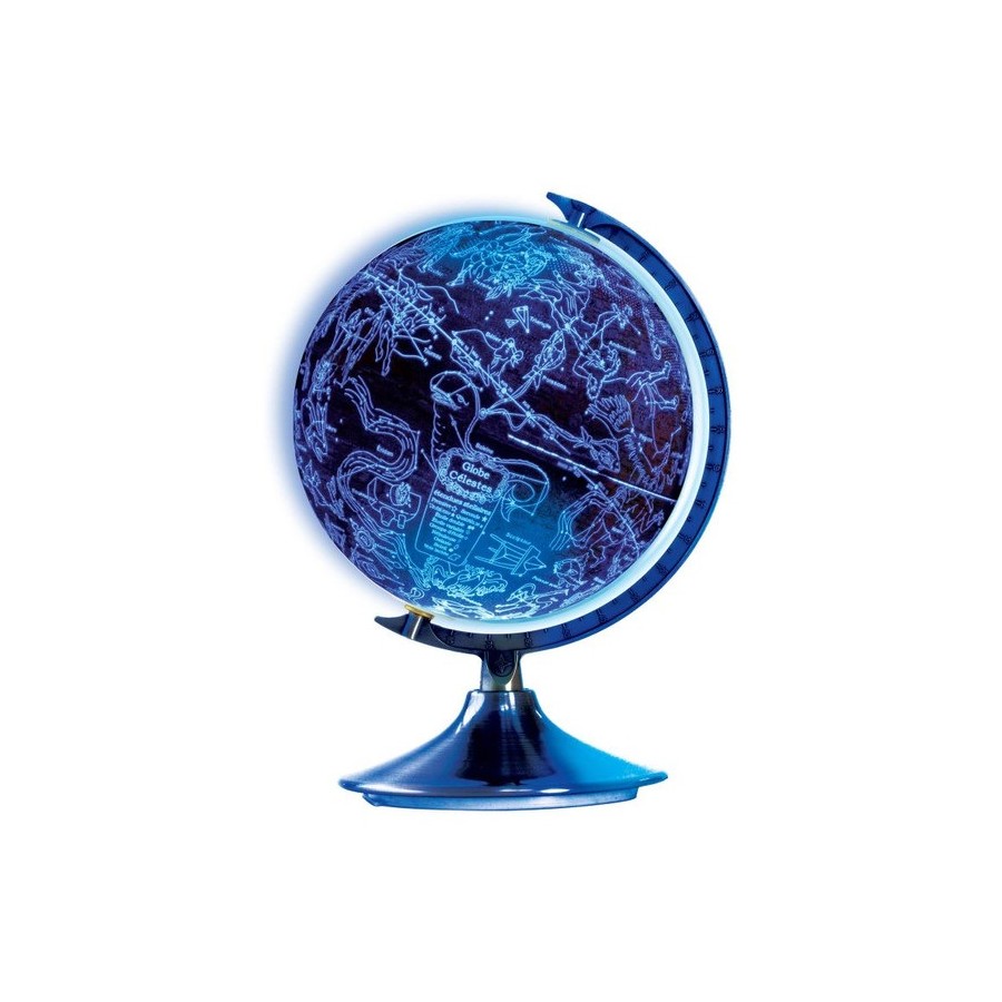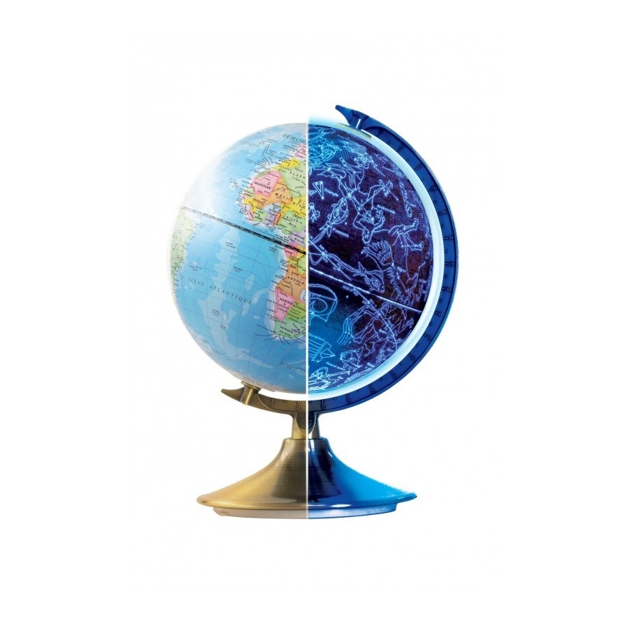 Um globo de 21 cm para observar a Terra durante o dia e as constelações à noite. O globo montado mede 21 cm de diâmetro em suporte de metal. Durante o dia: explore o globo com suas fronteiras políticas, mares, montanhas e cidades. À noite: contemple 88 constelações e aprenda seus nomes!