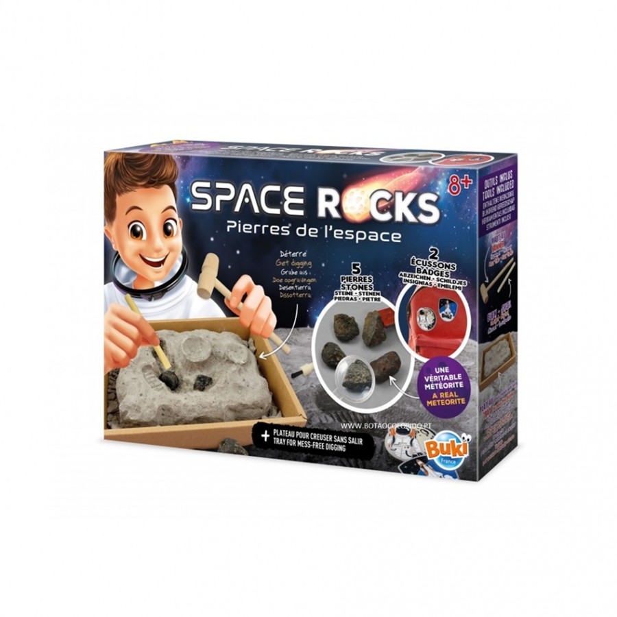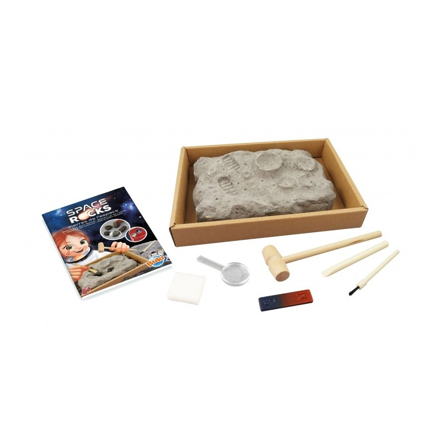 Usando o martelo e o cinzel, desenterre e observe cinco pedras do espaço, incluindo um meteorito rochoso real e tectitos. Use a bandeja para cavar sem se sujar.