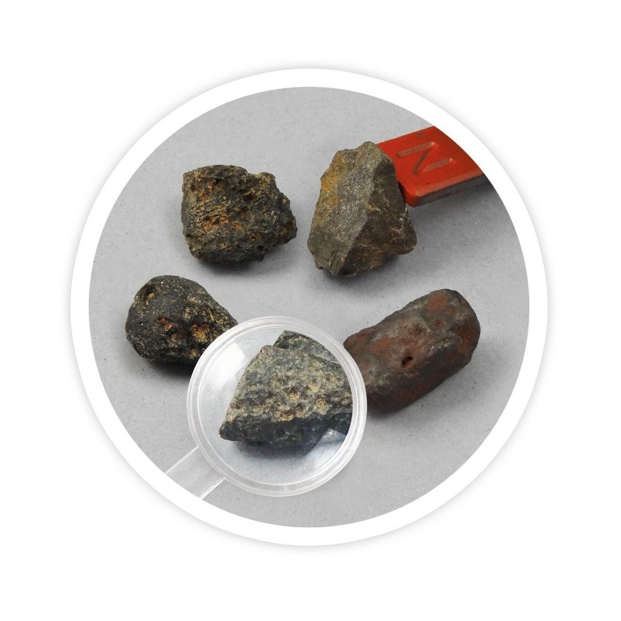 Usando o martelo e o cinzel, desenterre e observe cinco pedras do espaço, incluindo um meteorito rochoso real e tectitos. Use a bandeja para (...)