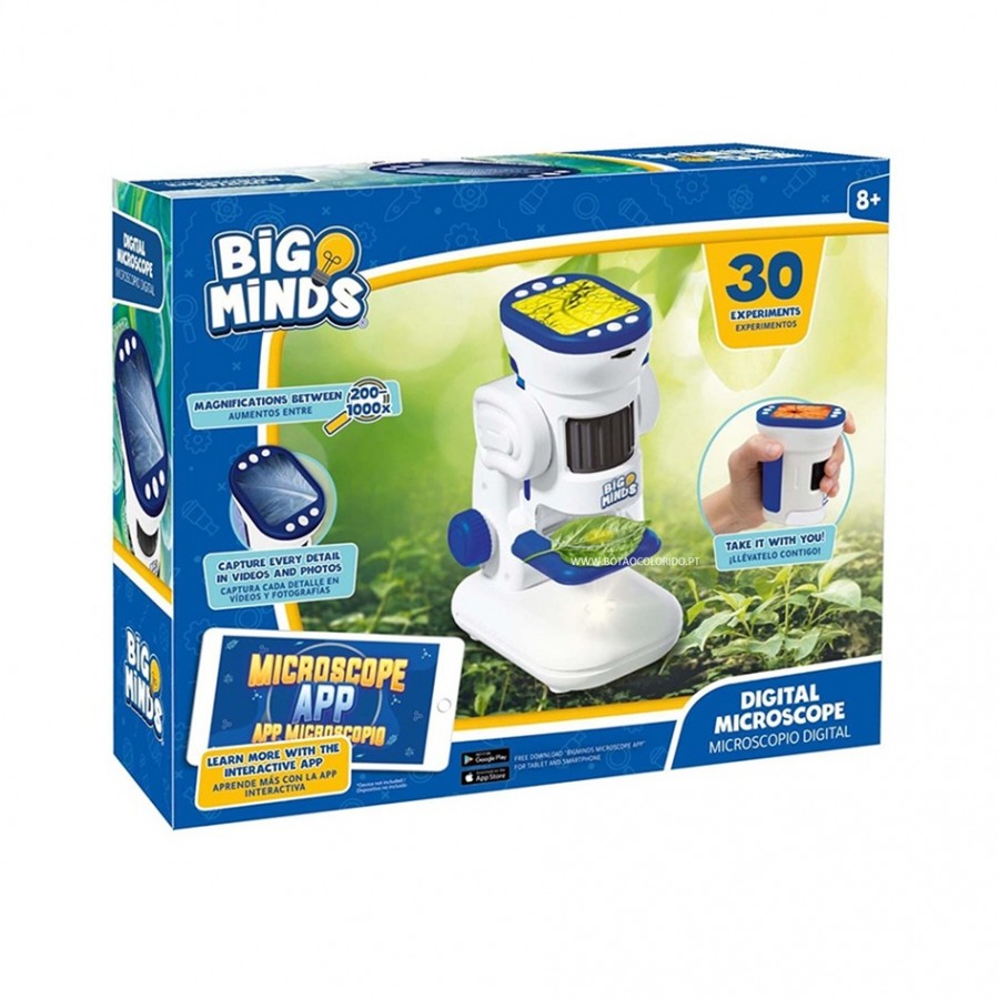 Descobre o mundo microscópico com o microscópio digital. O Microscópio Digital é a ferramenta perfeita para que meninas e meninos explorem o fascinante mundo do micromundo. Equipado com um ecrã LED de 2 polegadas, este microscópio permite observar e capturar imagens e vídeos de alta resolução das tuas descobertas. Com ampliações que variam entre 200x e 1000x, os pequenos cientistas poderão ver detalhes que são invisíveis a olho nu.