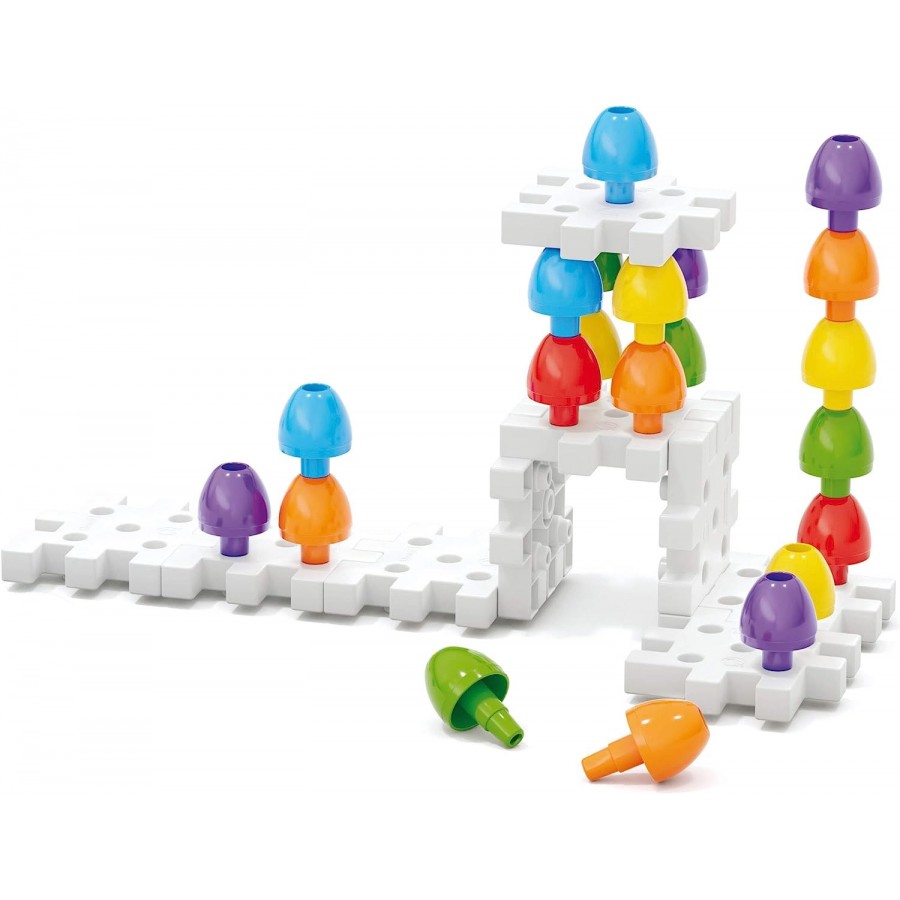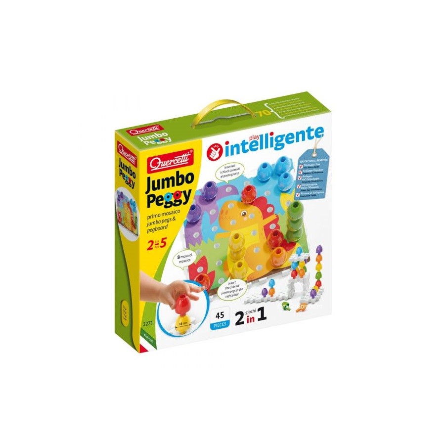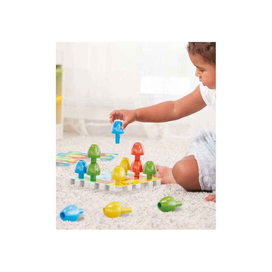 Uma primeira abordagem aos jogos de "peg" para crianças de 2 anos ou mais. 16 pinos grandes para armazenamento, 4 placas para unir e 4 cartões ilustrados em ambos os lados, onde as crianças podem fazer seus mosaicos coloridos. Tire as ilustrações e as placas e os pinos se tornam um jogo de construção original, permitindo que as crianças façam torres altas ou qualquer estrutura que desejem. Um óptimo jogo que ajuda a desenvolver habilidades motoras finas e coordenação olho-mão.