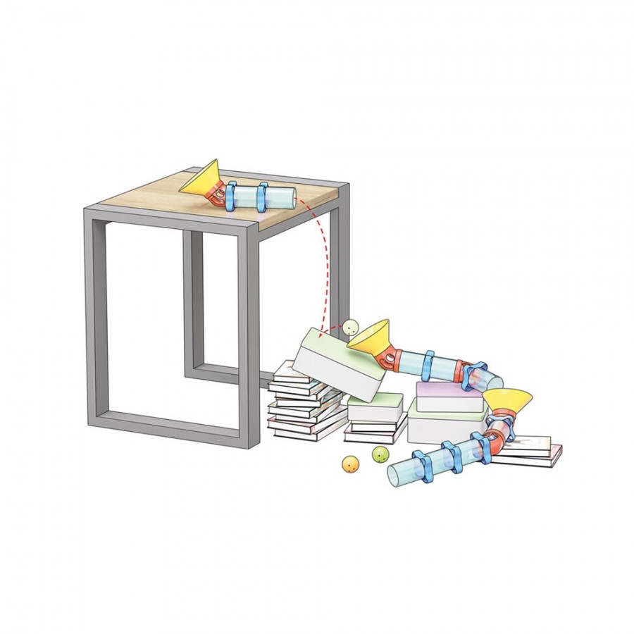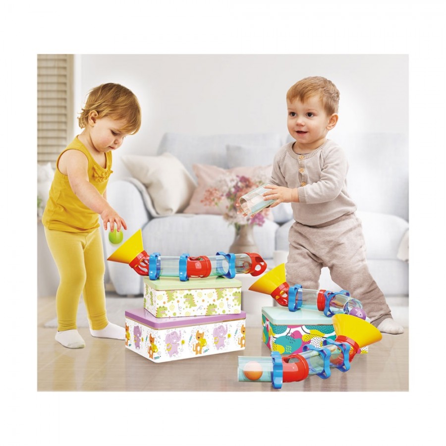 Contém: 3 funis; 9 colunas; 7 voltas; 8 anéis de conexão; 3 bolas grandes |Brinquedo STEAM | Marca: Quercetti | Medidas: 39 x 33.5 x 9.5 Cm | fabricado em Itália | Idade: 2-5 anos