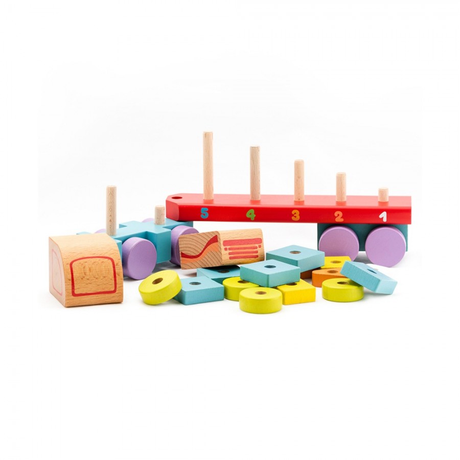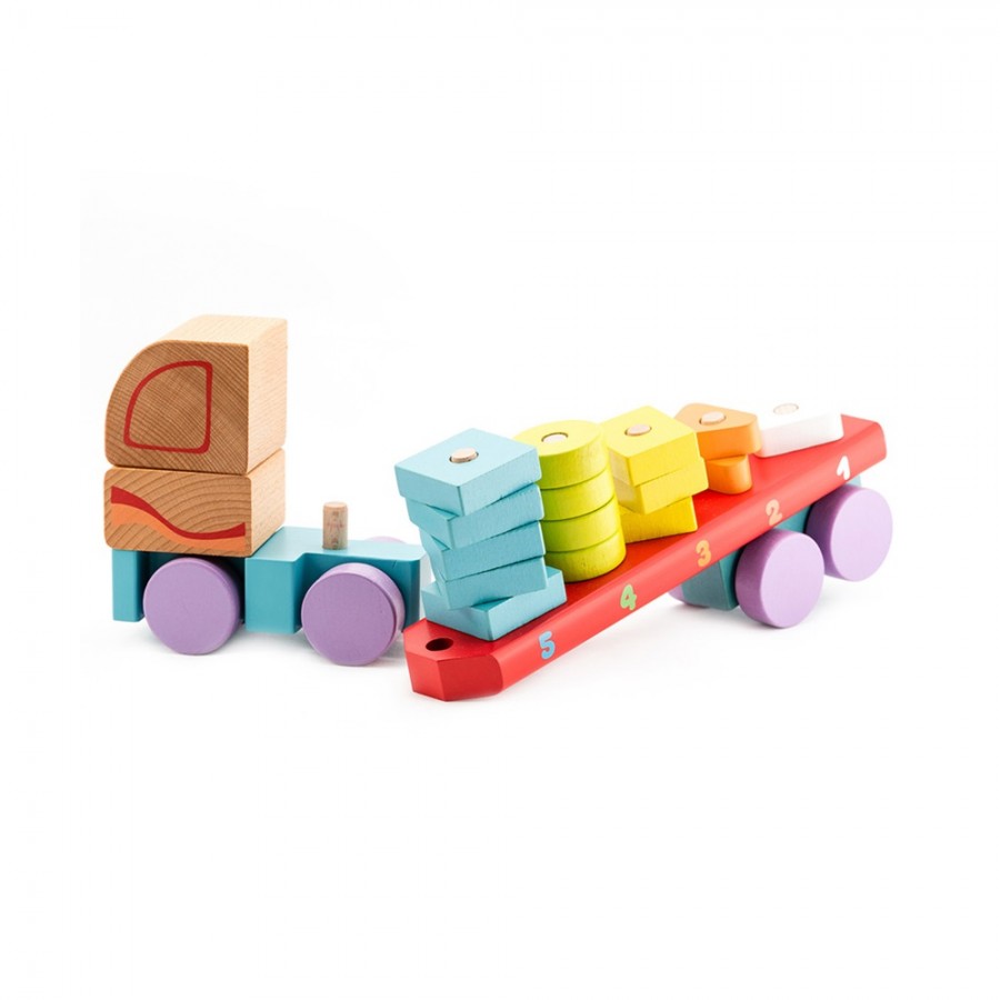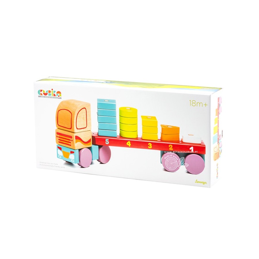 Este camião de transporte é um brinquedo 2 em 1. É um camião manobrável com cabine e reboque. Além disso, é um empilhador e classificador de formas. Ajuda a desenvolver capacidades motoras, de movimento e de coordenação. Também estimula a criatividade da criança.