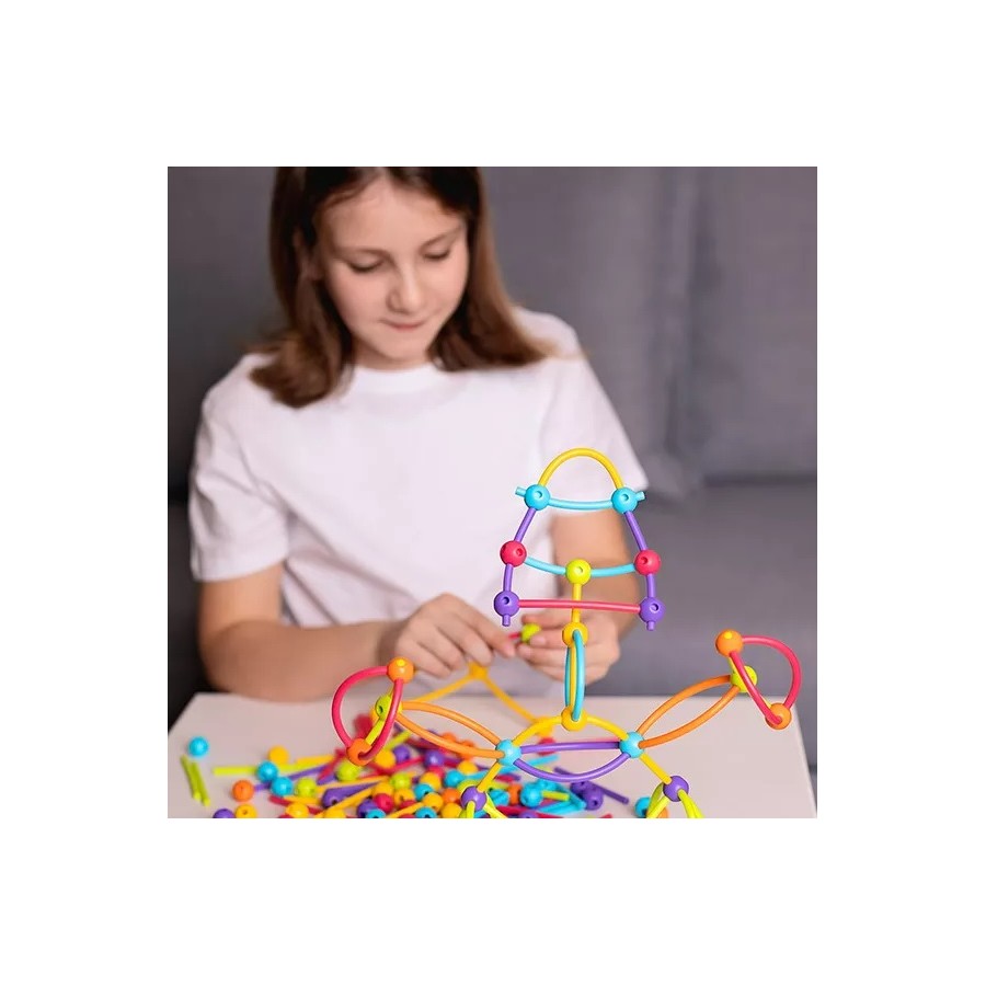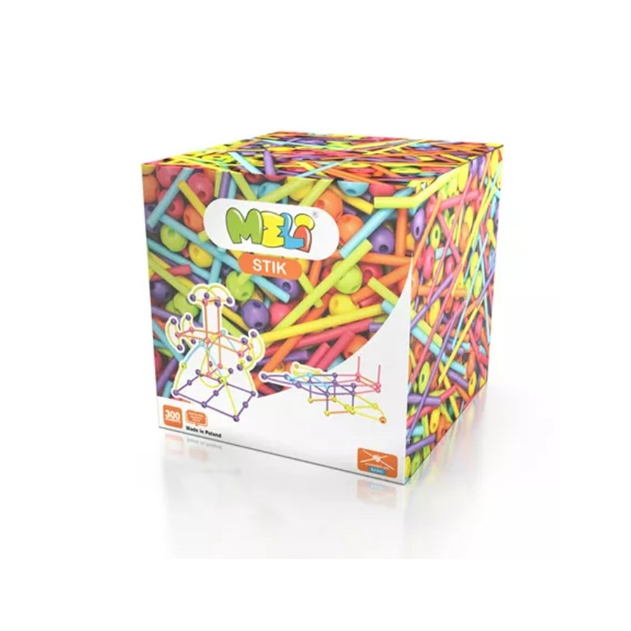 Meli Stik são varas flexíveis feitas de plástico macio, maleável e completamente seguro, que podem ser conectadas através de esferas únicas. Cada esfera tem 6 orifícios para unir as peças em vários ângulos, permitindo criar estruturas incríveis.
