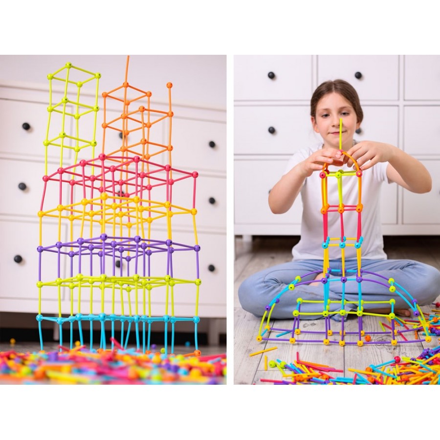 Meli Stik são varas flexíveis feitas de plástico macio, maleável e completamente seguro, que podem ser conectadas através de esferas únicas. Cada esfera tem 6 orifícios para unir as peças em vários ângulos, permitindo criar estruturas incríveis.