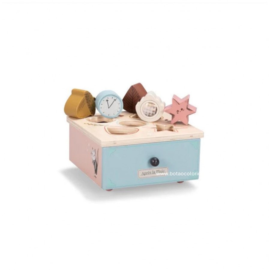Caixa de encaixe de formas em madeira com lindas ilustrações para ajudar os pequenos a aprenderem sobre formas e cores. Contém 5 formas especialmente desenhadas para as mãozinhas (...)