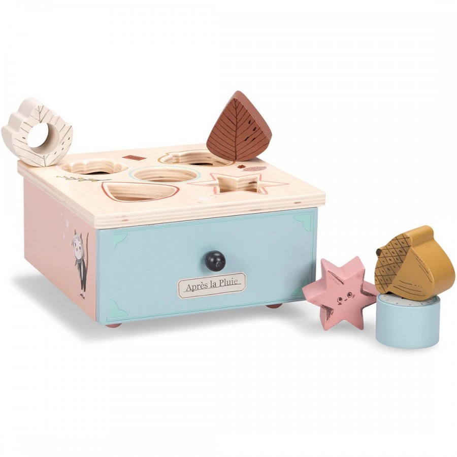 Caixa de encaixe de formas em madeira com lindas ilustrações para ajudar os pequenos a aprenderem sobre formas e cores. Contém 5 formas especialmente desenhadas para as mãozinhas das crianças. Cada orifício é circundado pela mesma cor da forma correspondente para facilitar a escolha.