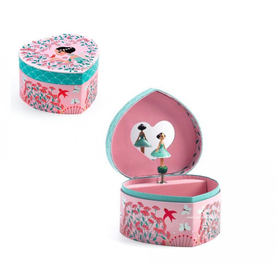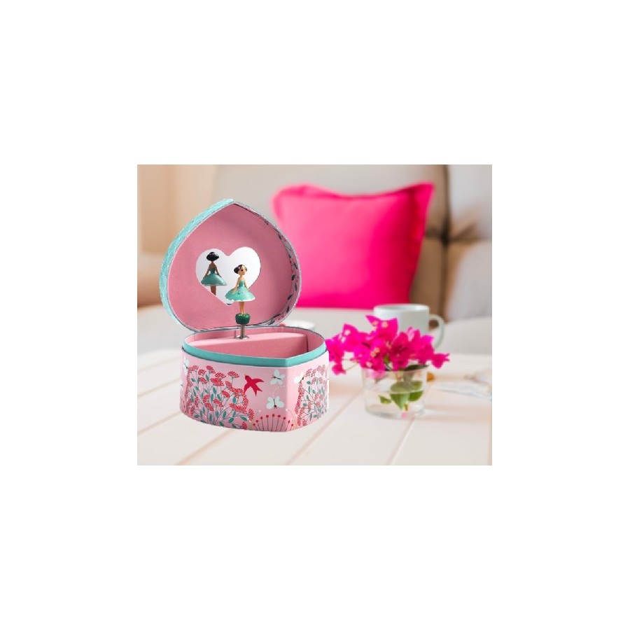 Uma linda peça decorativa em forma de coração para o quarto de uma criança. Delicada é uma caixa de música lindamente ilustrada com espaço para guardar jóias e tesouros. Gire a manivela, abra a caixa e surpresa! Uma menina finamente esculpida se vira e projecta o seu reflexo num espelho e dança ao som de "Convite para a Dançar" de Carl Maria Von Weber. A melodia dura aproximadamente 2,5 minutos. Interior forrado a veludo muito macio.