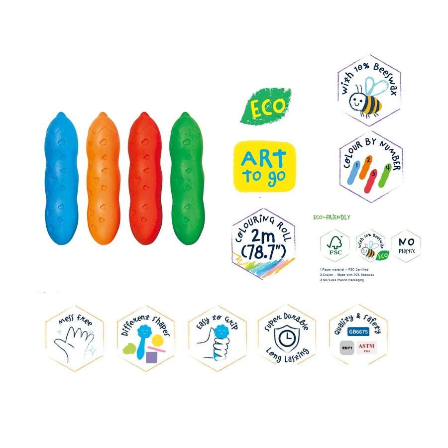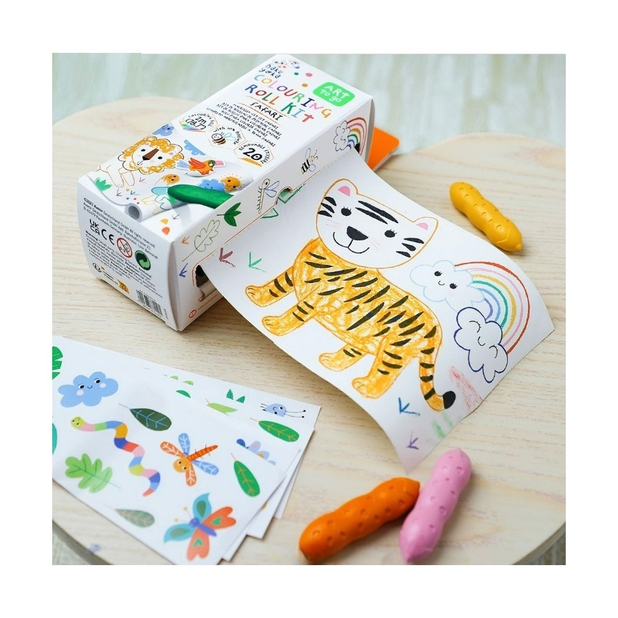 Este pratico conjunto inclui um rolo de 2m de comprimento e 4 lápis de cera Hi-Pea.
