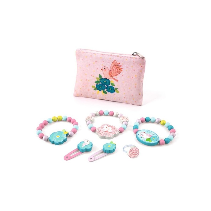Uma linda bolsa de tecido decorada com um pássaro para guardar todas as jóias que vêm incluídas nesta linda caixinha.