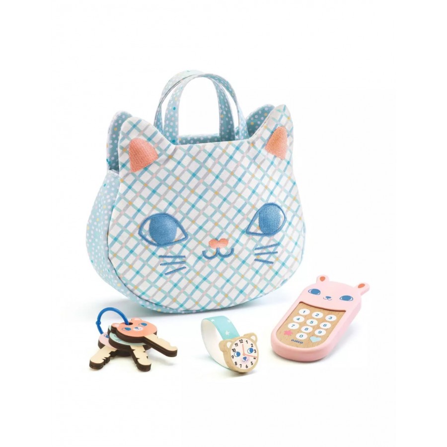 Uma bolsa em forma de cabeça de gato lindamente bordada. Contém acessórios essenciais para fazer tudo como a mamã.