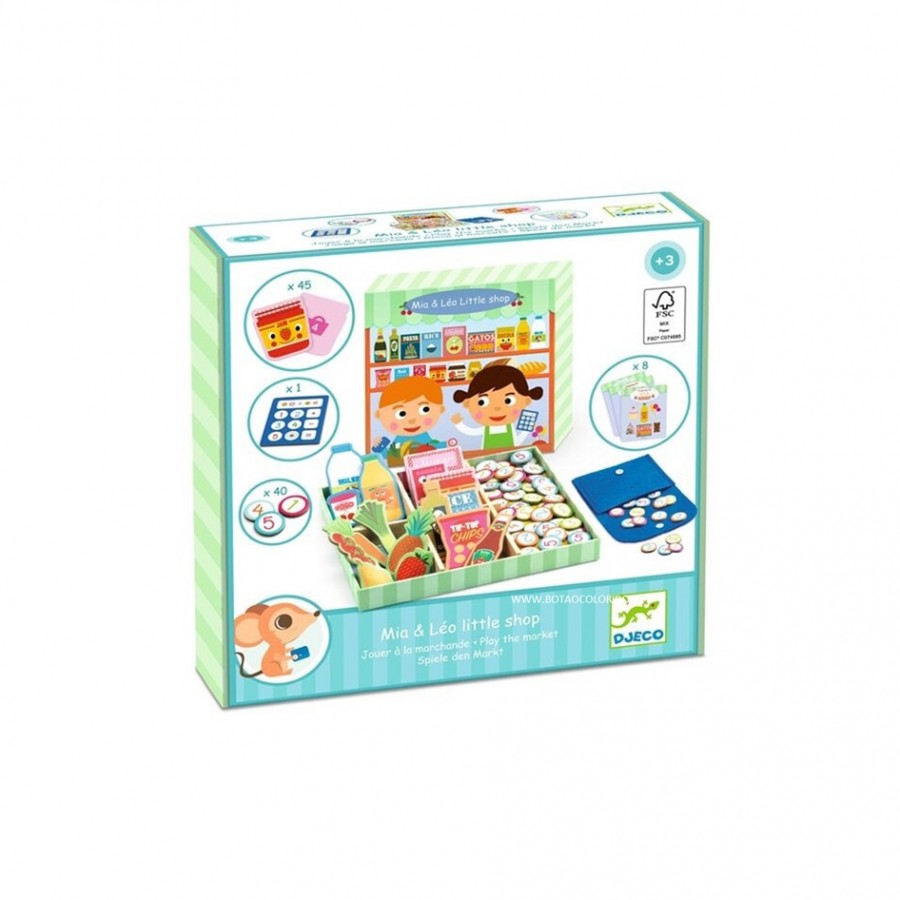 Bem vindos ao pequeno mercado de Mia & Léo, um conjunto completo com 45 acessórios para brincar às lojas. Cada pessoa tem seu papel! O comerciante organiza os produtos, mexe na caixa registadora e calcula a conta. O cliente faz as suas compras à vontade ou seguindo as listas de compras temáticas, antes de ir à caixa com a carteira.