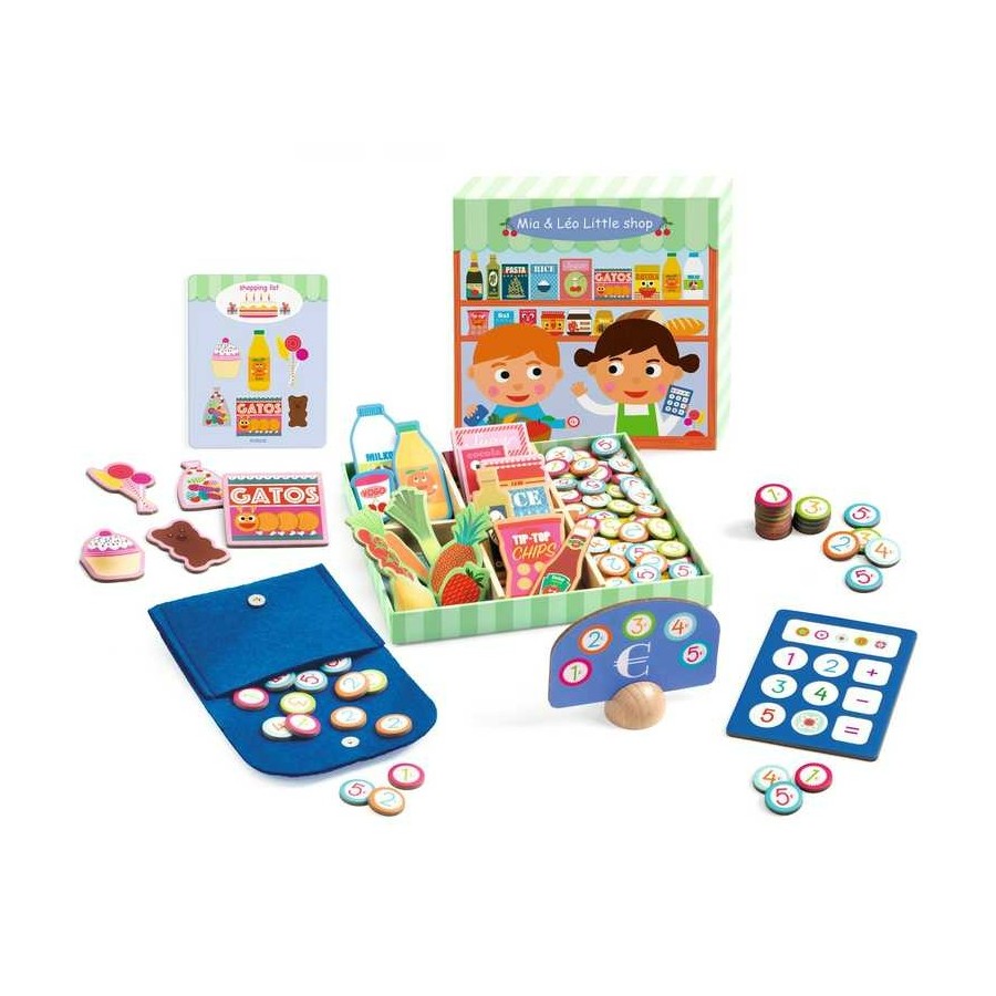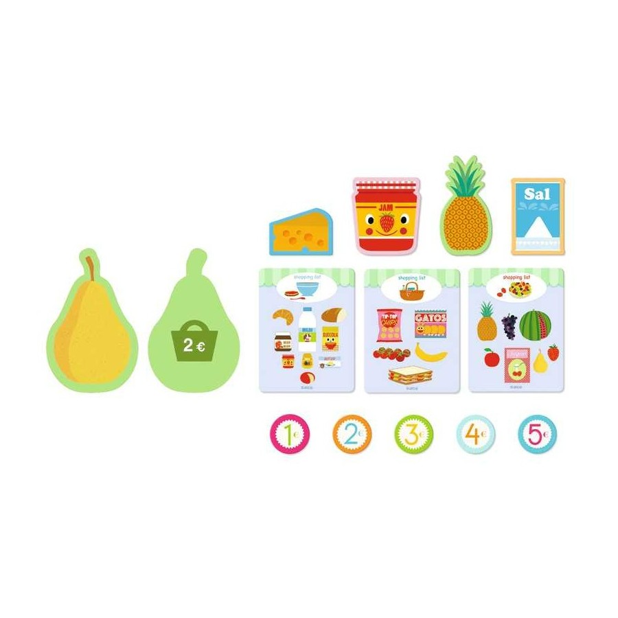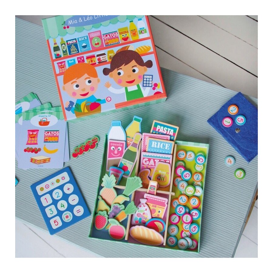 Marca: Djeco | Idade: 3-8 anos | Contém: 45 alimentos de cartão, 40 moedas de cartão, 2 painéis de madeira e 1 base de madeira, 1 calculadora de cartão, 8 cartões de lista de compras e 1 carteira de feltro com fecho magnético | Fabricado com papel e cartão com certificação FSC® |Design de Edouard Mancea