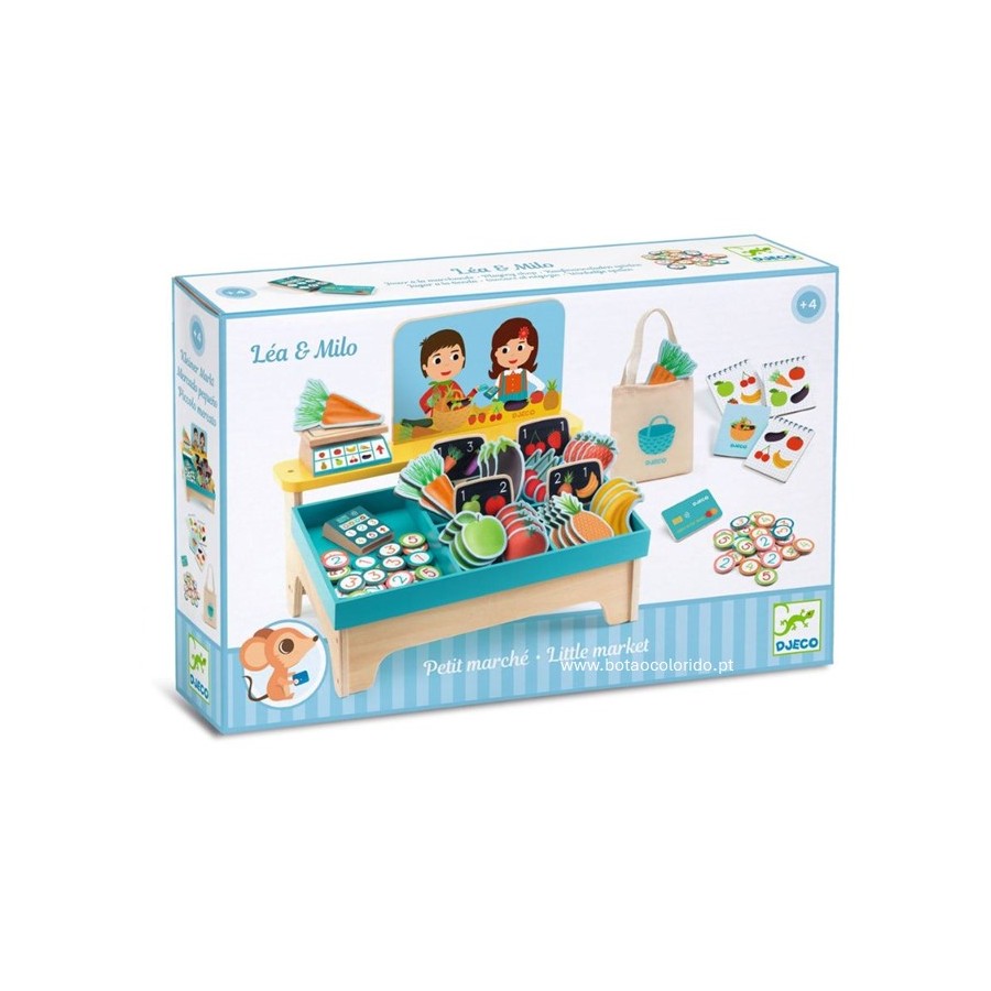 Marca: Djeco | idade: 3+ | Contém:1 banca, 1 balança, 1 máquina de cartão, 1 cartão bancário, 30 moedas, 4 lousas para preços, 29 frutas e legumes, 1 saco | Madeira com certificação FSC®. Dimensões da embalagem: 17 x 30 x 6 cm