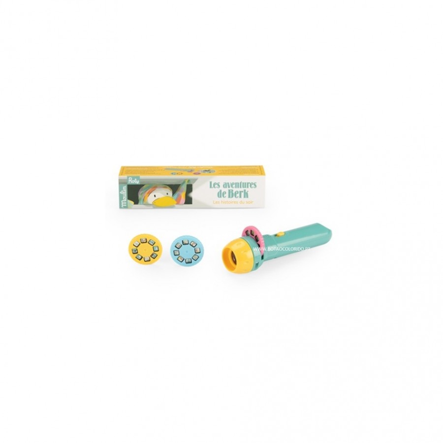 Descubra a Lanterna de Histórias da Moulin Roty, uma lanterna que projeta imagens coloridas para contar histórias encantadoras para o seu filho. Três discos, três histórias originais para descobrir as aventuras de Berk, o patinho intrépido e desastrado.
