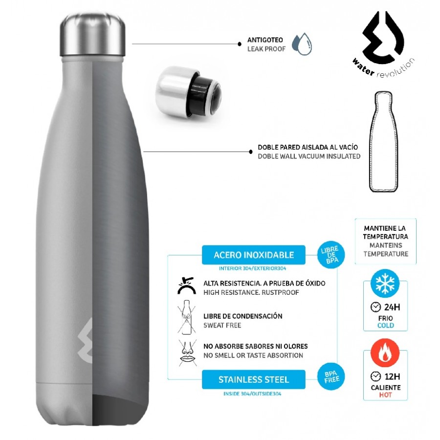 Garrafa térmica de aço inoxidável de 500ml, com isolamento de camada dupla projetada para armazenar bebidas quentes e frias. 24h frio / 12h quente. Fabricado em aço inox 18/8 (304/304) A tampa é confeccionada em aço inox, polipropileno e junta de silicone, o que a torna totalmente hermética e estanque.