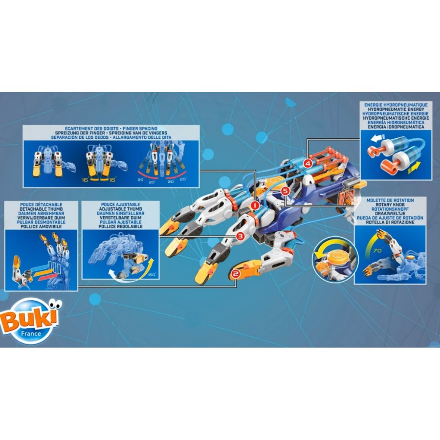 Prontos para entrar no mundo da robótica? Construa uma mão ciborgue articulada montando as peças. Adicione água ao sistema e controle-o com a ponta dos dedos. A mão pode ser ajustada para carregar objetos como bolas ou garrafas. Pode ser adaptado para uso tanto por canhotos quanto por destros.