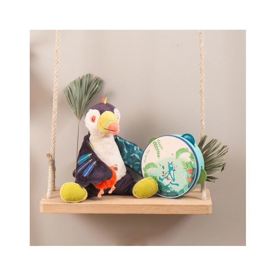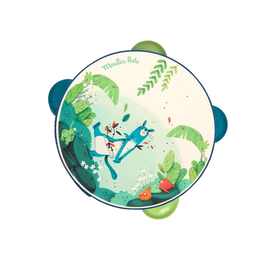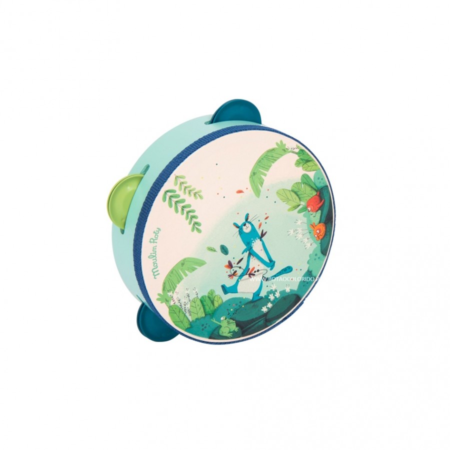 Pandeireta perfeita para mãos pequenas! Feito em madeira, perfeito como primeiro instrumento para introduzir as crianças no mundo dos sons, do ritmo e da música! Com a pantera Zimba, um sapo cantor, pássaros e uma cena de selva.