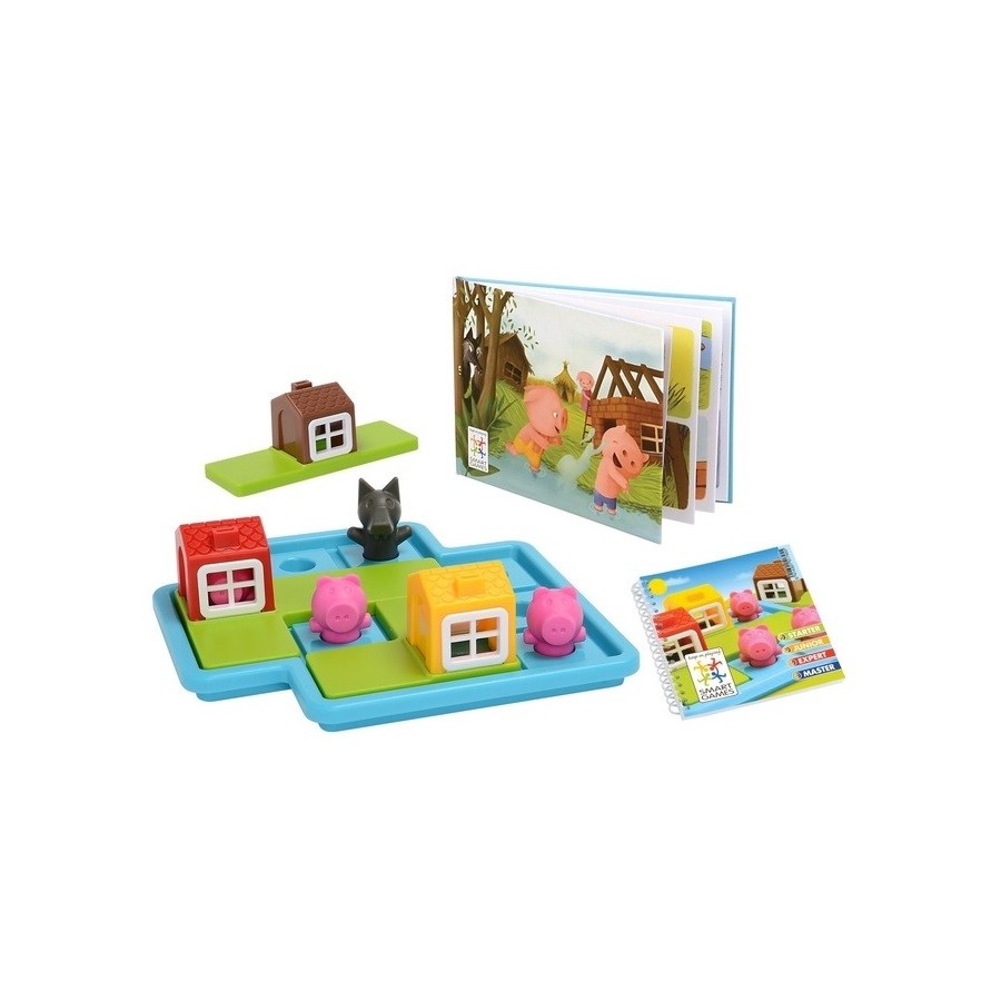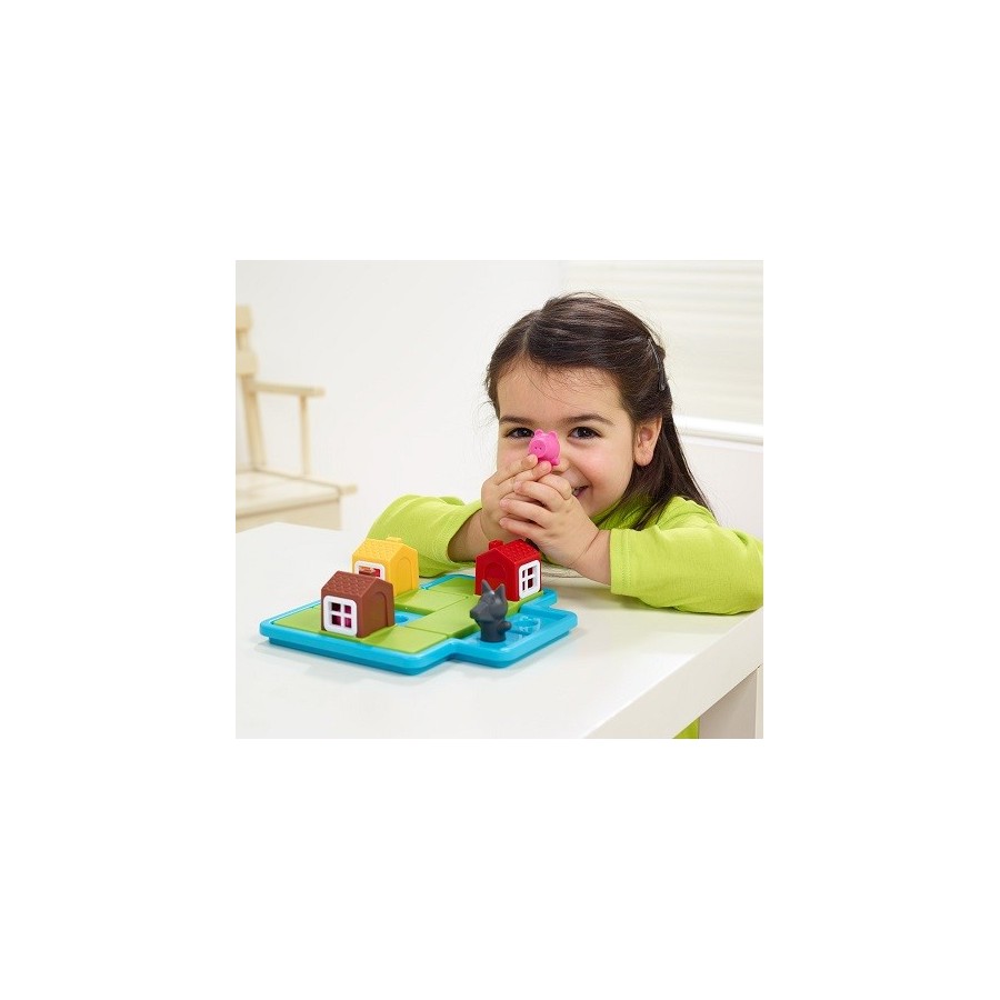 Era uma vez… Consegues ajudar estes três inteligentes porquinhos a construir as suas casas? Existem desafios em que os 3 porquinhos ficam do lado de fora da casa e outros em que aparece o Lobo Mau e aí eles têm que ficar, em segurança, dentro das suas casa! "Three little piggies" é um jogo perfeito do raciocínio lógico para as crianças. Possui 3 grandes peças de encaixe tipo puzzle que são fáceis de segurar, e as crianças vão ficar intrigado pela forma como os porcos se encaixam dentro das casas e a olhar através das janelas. O jogo inclui um livro de história com imagens e livro com 48 desafios (24 com o lobo/versão noite e 24 sem/versão dia).