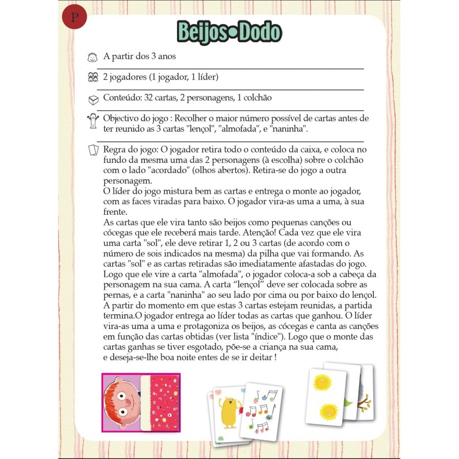 Este jogo com 32 cartas, adaptado aos mais pequenos tornar-se-á rapidamente num ritual na hora de deitar: uma almofada, um lençol e um "doudou" de conforto ... e Boa noite! Com este jogo o seu filho(a) vai adorar a hora de ir para a cama pois com alguma sorte vai receber muitos beijinhos, cócegas e .... antes de dormir.