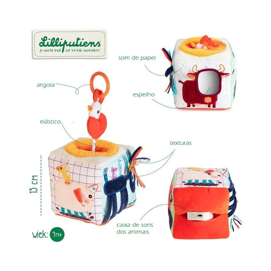 Descubra as actividades, histórias e 7 sons diferentes neste cubo macio do tema da quinta. Com anel de dentição e sons de animais, estimula os sentidos, a imaginação e as habilidades motoras.