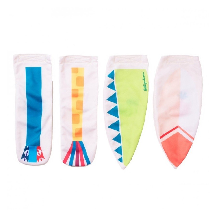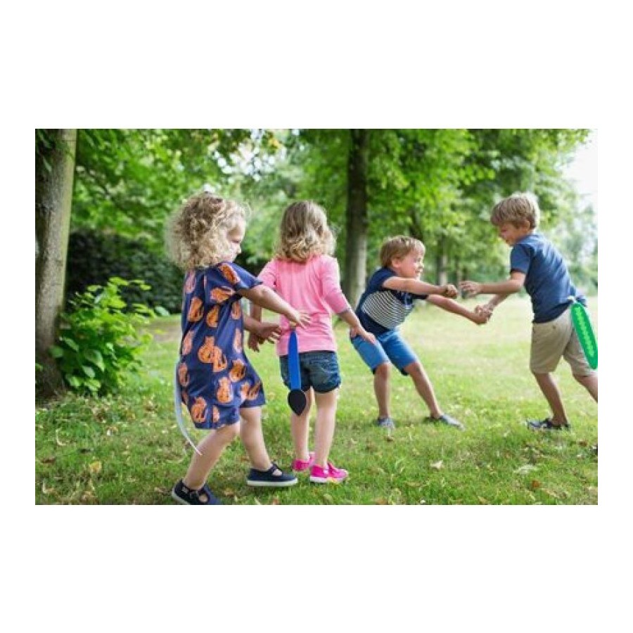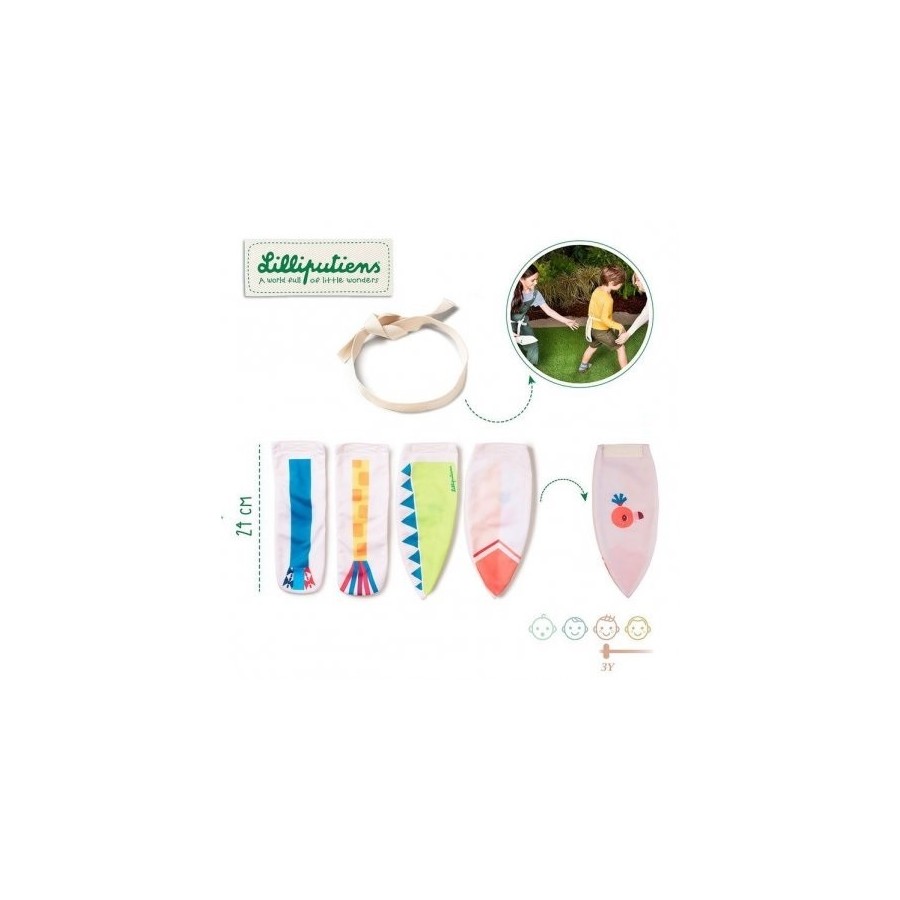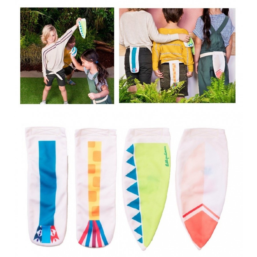 Quem vai ser o último a manter a sua "cauda" e a ganhar o jogo? Divertido jogo de apanhar caudas da Lilliputiens composto por 4 caudas com diferentes cores: cauda de dinossauro verde; cauda de girafa laranja; cauda azul com pontas azuis e vermelhas; cauda riscas rosa e branca com uma ponta vermelha. Na cauda há um laço que é preso ao redor da cintura. A cauda é presa ao laço com velcro, o que facilita o apanhar durante o jogo.