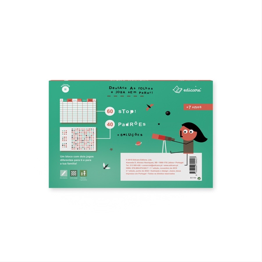 Um bloco com 2 jogos que podes transportar facilmente e jogar em qualquer lado: padrões e stop. Muitas folhas de cada um deles para usar e destacar, que garantem diversão com os teus amigos e a tua família ou sozinho!