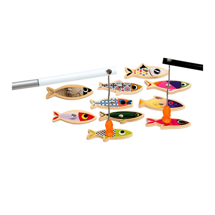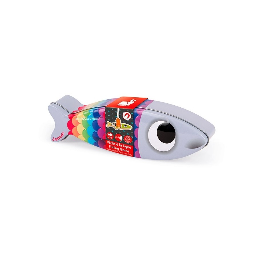 Que divertido é pescar com estas canas de pesca magnéticas! Quem irá apanhar mais peixe? Este divertido jogo de pesca vem com 10 sardinhas de madeira coloridas e 2 canas magnéticas para uma emocionante competição de pesca. Além disso, o conjunto vem numa bela lata em forma de sardinha, perfeita para transportar o jogo para onde quer que vás.