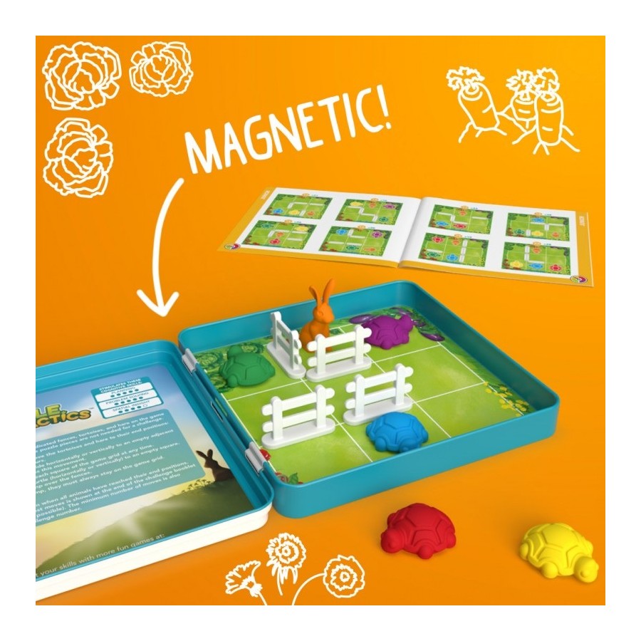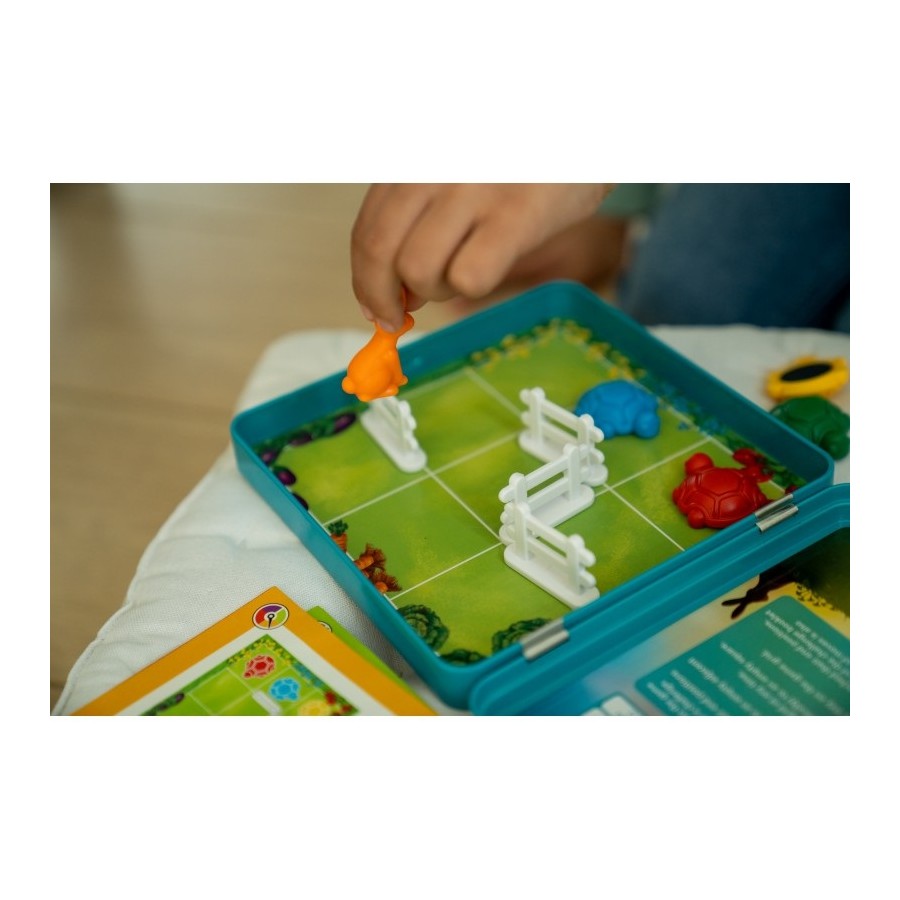 Desliza os animais pelo tabuleiro para encontrar as suas refeições. Quem chegará mais rápido: a tartaruga ou a lebre? Um divertido e desafiador jogo de quebra-cabeças que vem em num prático estojo de viagem de metal para que não percas peças. 48 desafios para manter seu cérebro em movimento!