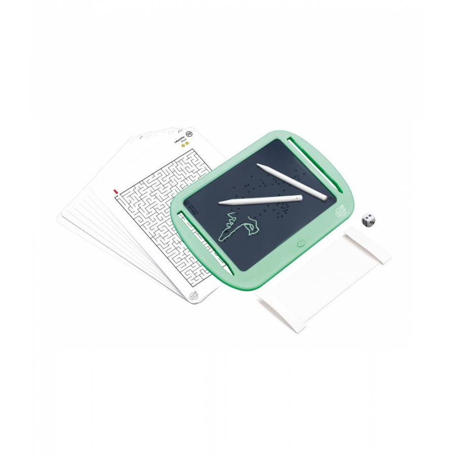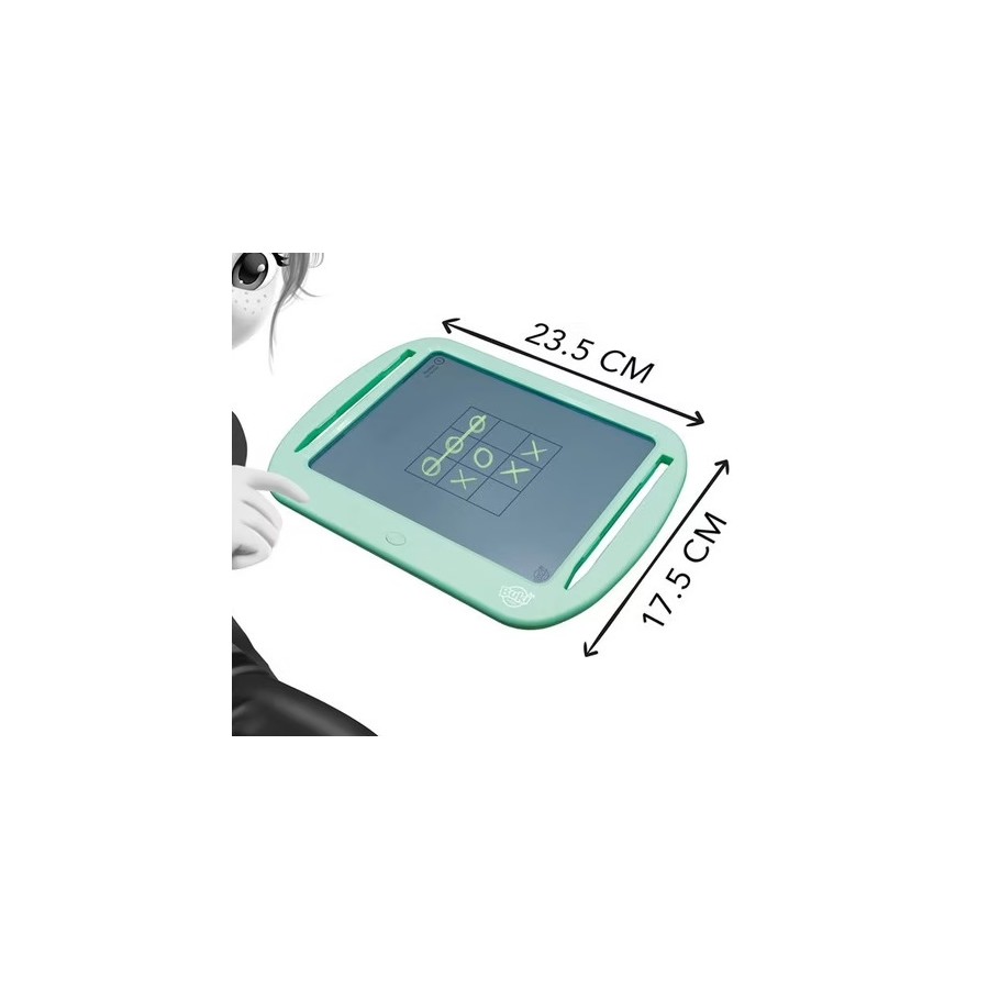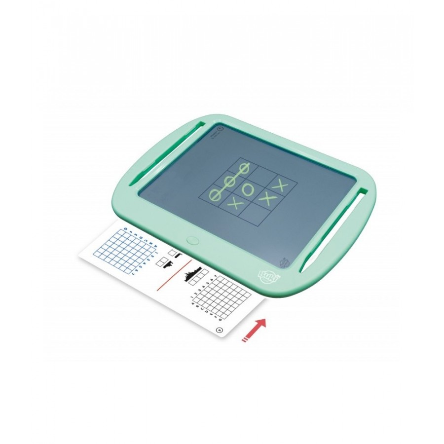 Insira um cartão sob o tablet para jogar jogos como labirintos, jogo do galo, batalha naval ou desafio de sudoku (entre outros). Marque, escreva ou desenhe usando as duas canetas incluídas e pressione o botão para apagar e iniciar o jogo novamente.